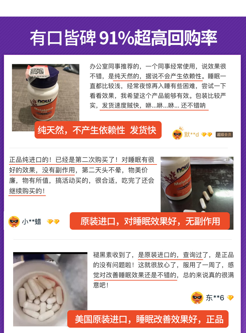 服用褪黑素的感受:小编正在服用一款褪黑素,觉得还是有一些效果的,此前小编天天熬夜,正常是2点多才睡,到5、6点时会频繁的醒来,睡眠质量很差。吃了之后,约30分钟左右,有明显睡意,夜间基本不醒,但是天天做梦(哭),早上需要闹钟,才能醒(此前都是生物钟),对于改善睡眠,还是有一定效果的,无明显依赖,经常忘记吃,也没什么不好的情况。