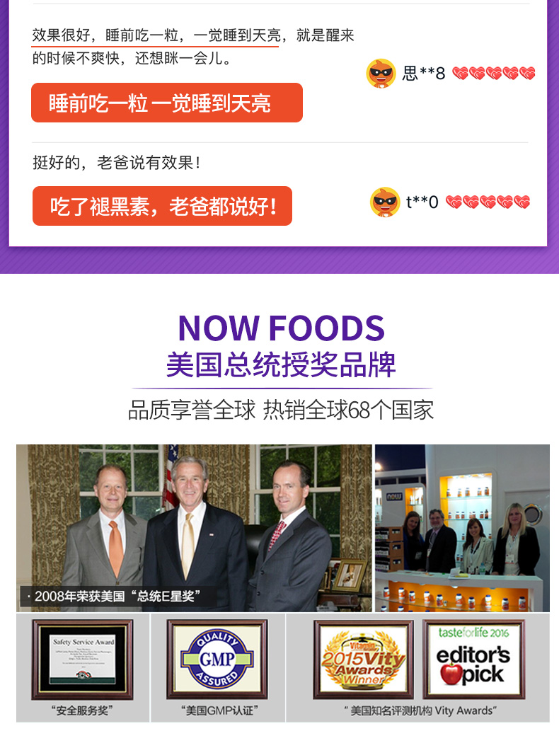 NOWFOODS发展至今,已多次获得保健食品生产界多项之最高荣誉大奖,如:NNFA国际级GMP评定为“最高荣誉A级优良保健食品制造商大奖”、国际安全协调会(NzrionalSaferyCounci)颁发“完美记录奖”(PerfectRecordAward)等等。