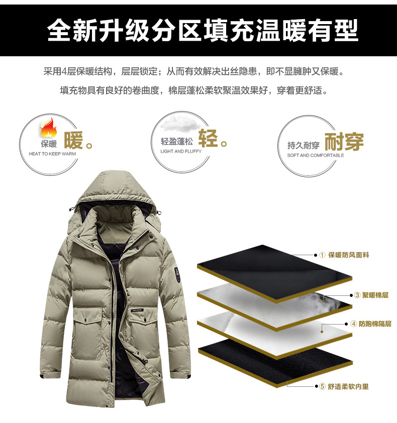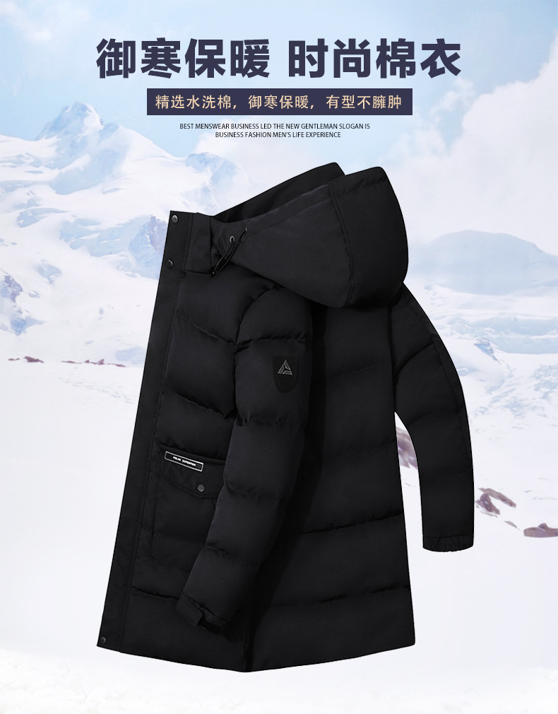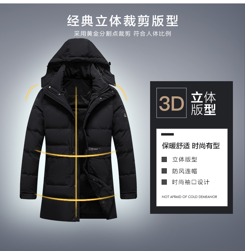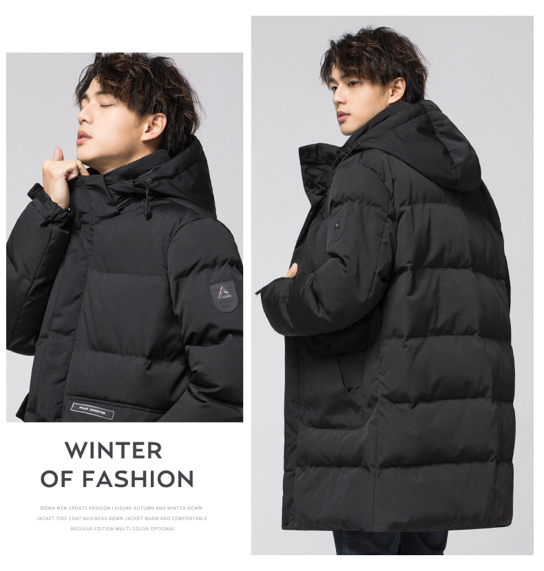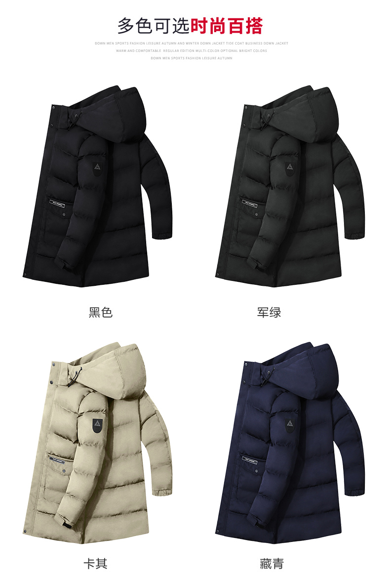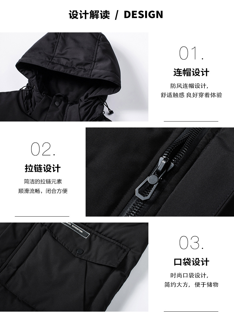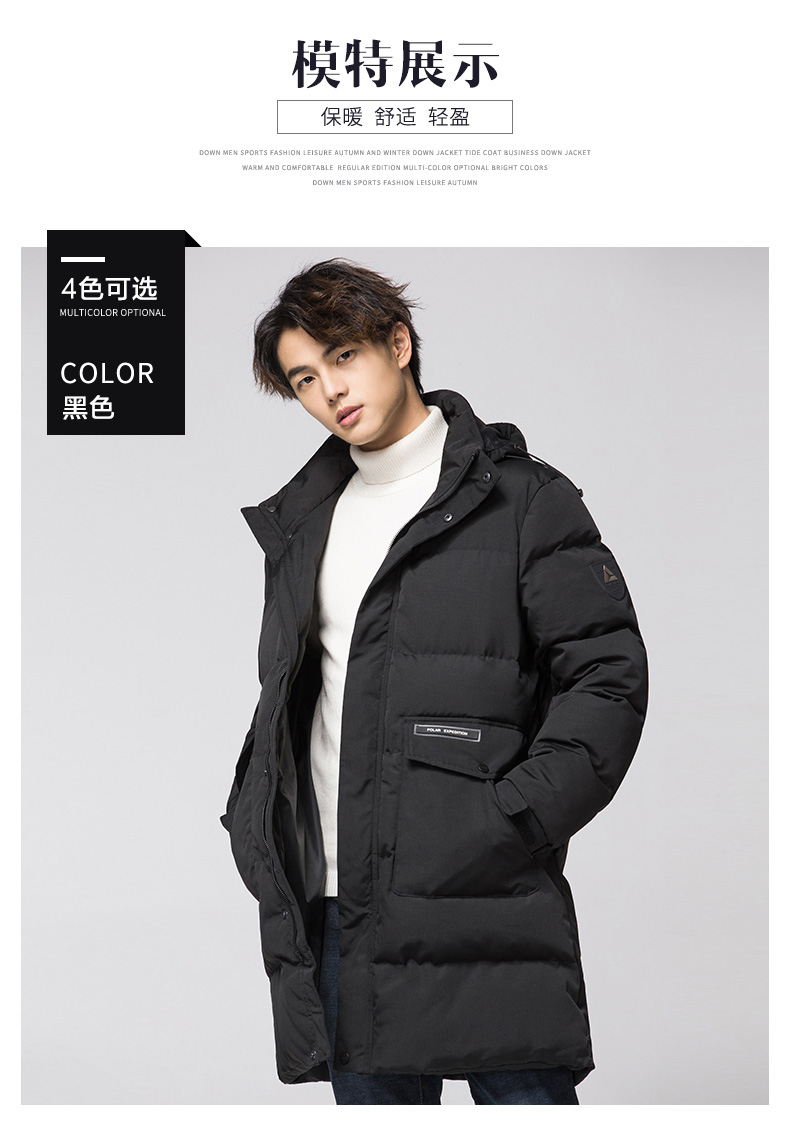 合体版型,上身不臃肿,基本不挑身材。连帽款式,搭配袖口采用魔术贴设计,防止冷风灌入,提升保暖效果。经典中长款设计,没有多余装饰,休闲商务百搭穿着。