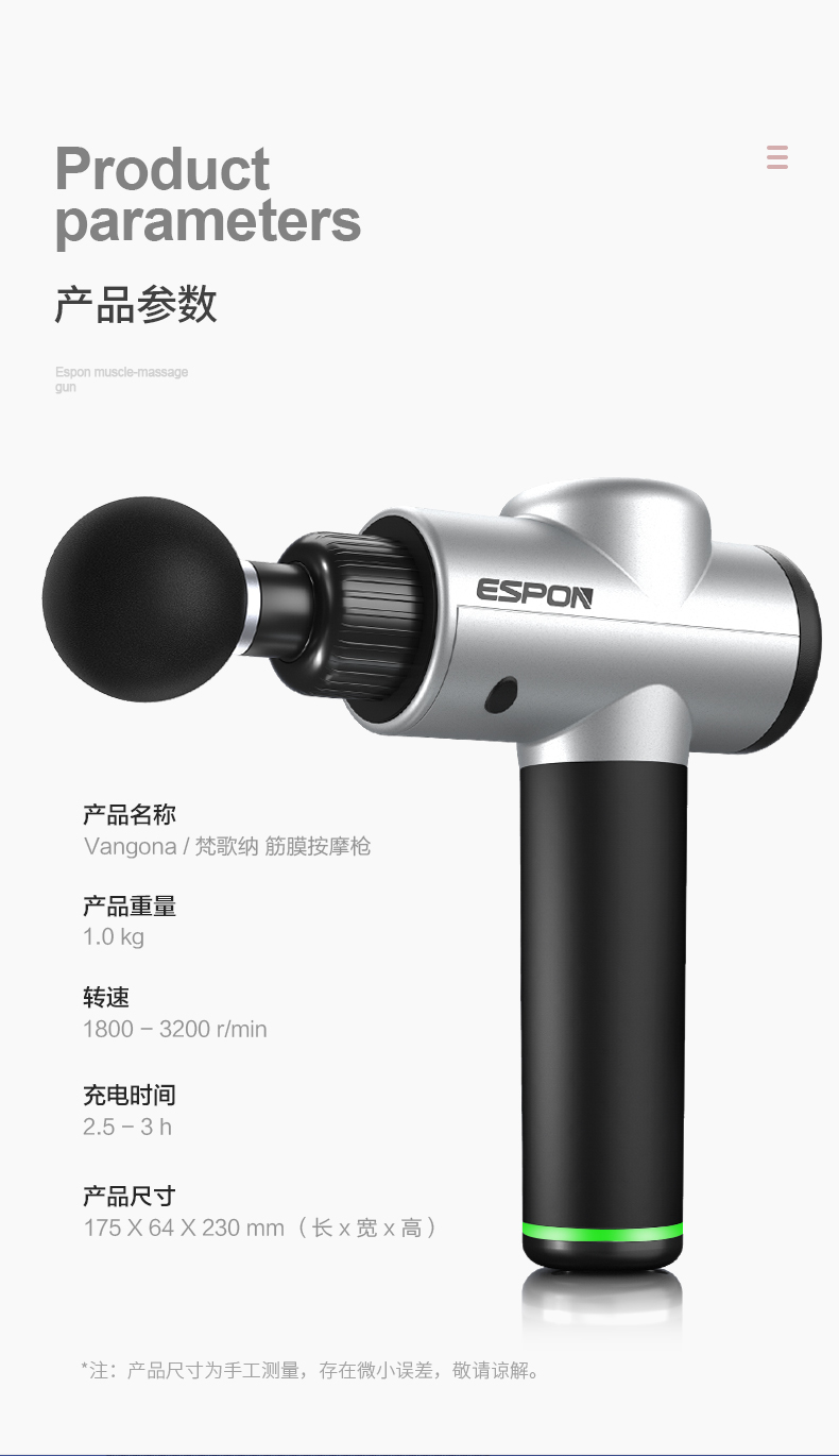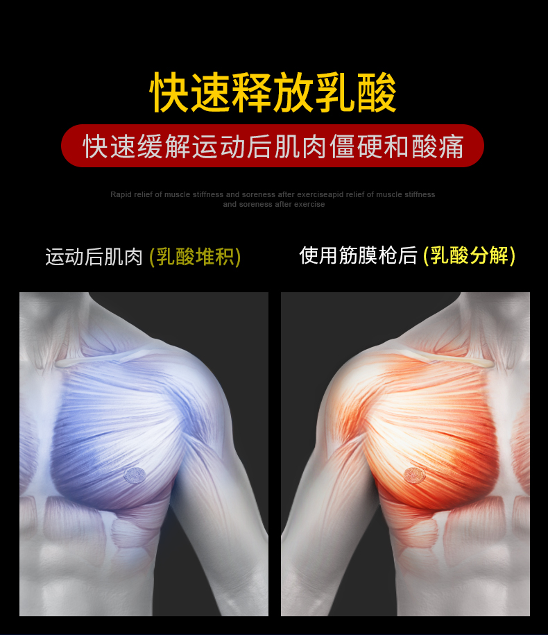 筋膜按摩枪,通过高频振动,以达到缓解长期久坐、剧烈运动所导致的身体酸痛、缓解肌肉紧绷的功效,适用于日常生活中肌肉酸痛僵硬,快速激活肌肉组织,促进血液淋巴回流。