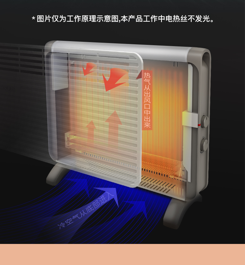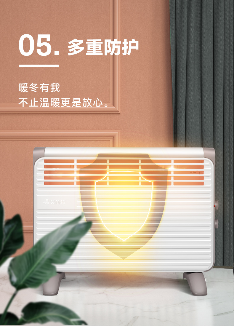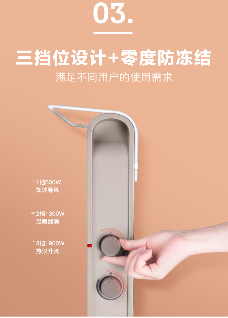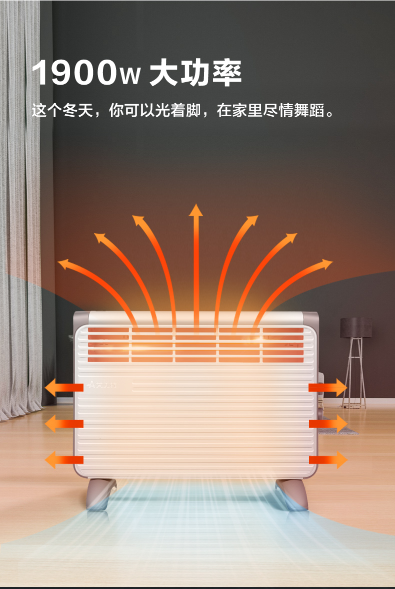 使用热对流循环原理,360°全屋升温;三档温度设计,1档600W、2档1300W、3档1900W。IPX2级防水,浴室内也能使用,无惧一般的泼水。