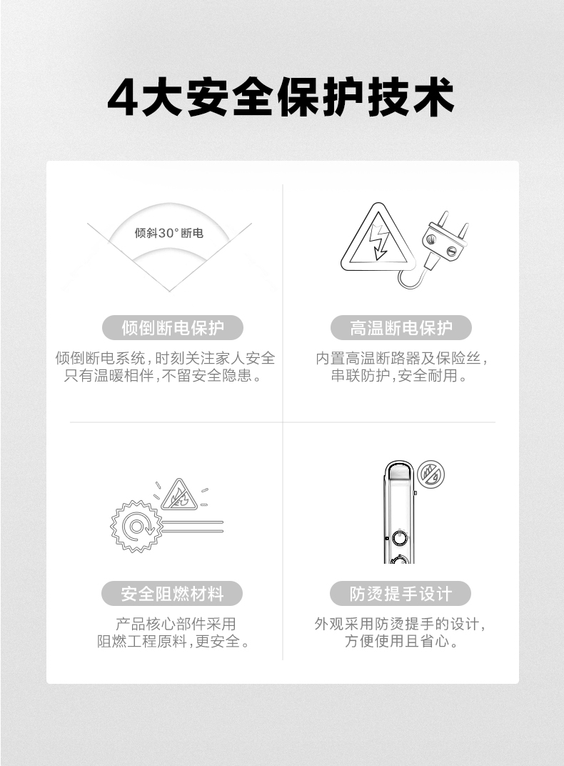 安全方面,当取暖器倾斜超过30度时,自动断电;内置高温断路器及保险丝,串联防护;核心部件使用阻燃原料制成,减少燃烧的可能性;外观是防烫设计。