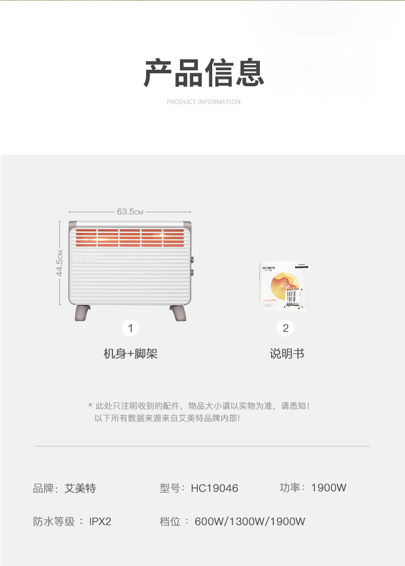 这款艾美特HC19046速热电取暖器暖,1900W大功率,居浴两用。采用双面发热丝发热,体积小,数量多,发热丝组长度达50cm,1900W大功率,升温快速,即开即热。