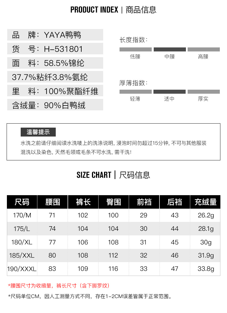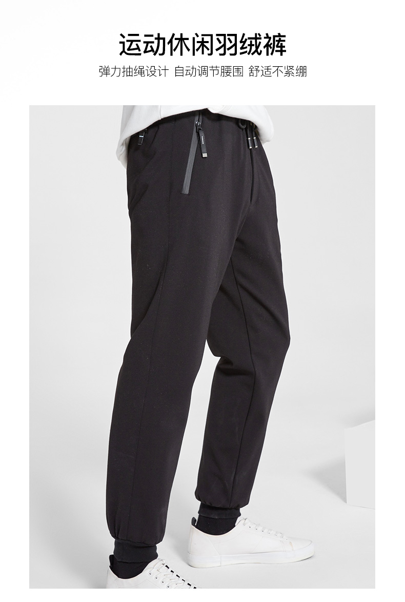 这款鸭鸭羽绒裤,内里填充优质90白鸭绒,多层隔舱充绒,多重防绒措施,牢固耐穿,不易钻绒。修身款式,上身不臃肿。隐藏式拉链口袋设计,置物方便;裤脚为漱口设计,防止冷风灌入,蹲坐时不会上提露出脚踝,提升保暖效果。款式简约大方,休闲百搭。鸭鸭旗舰店,品质有保障。