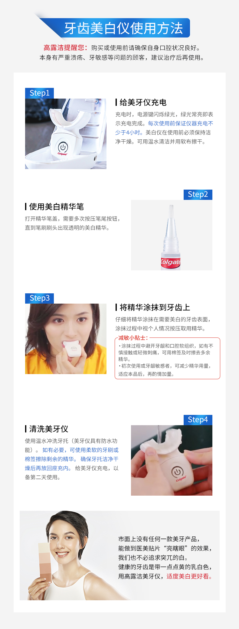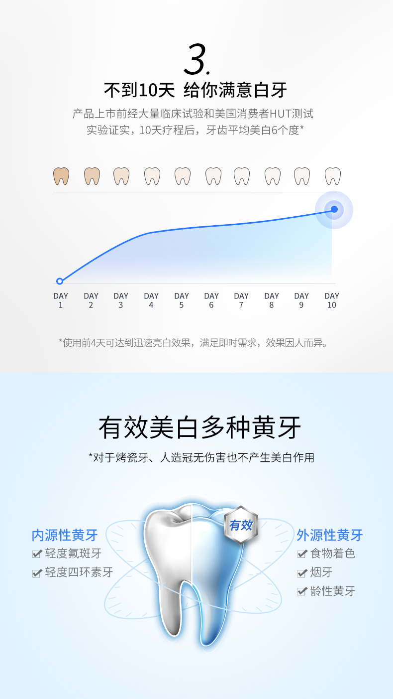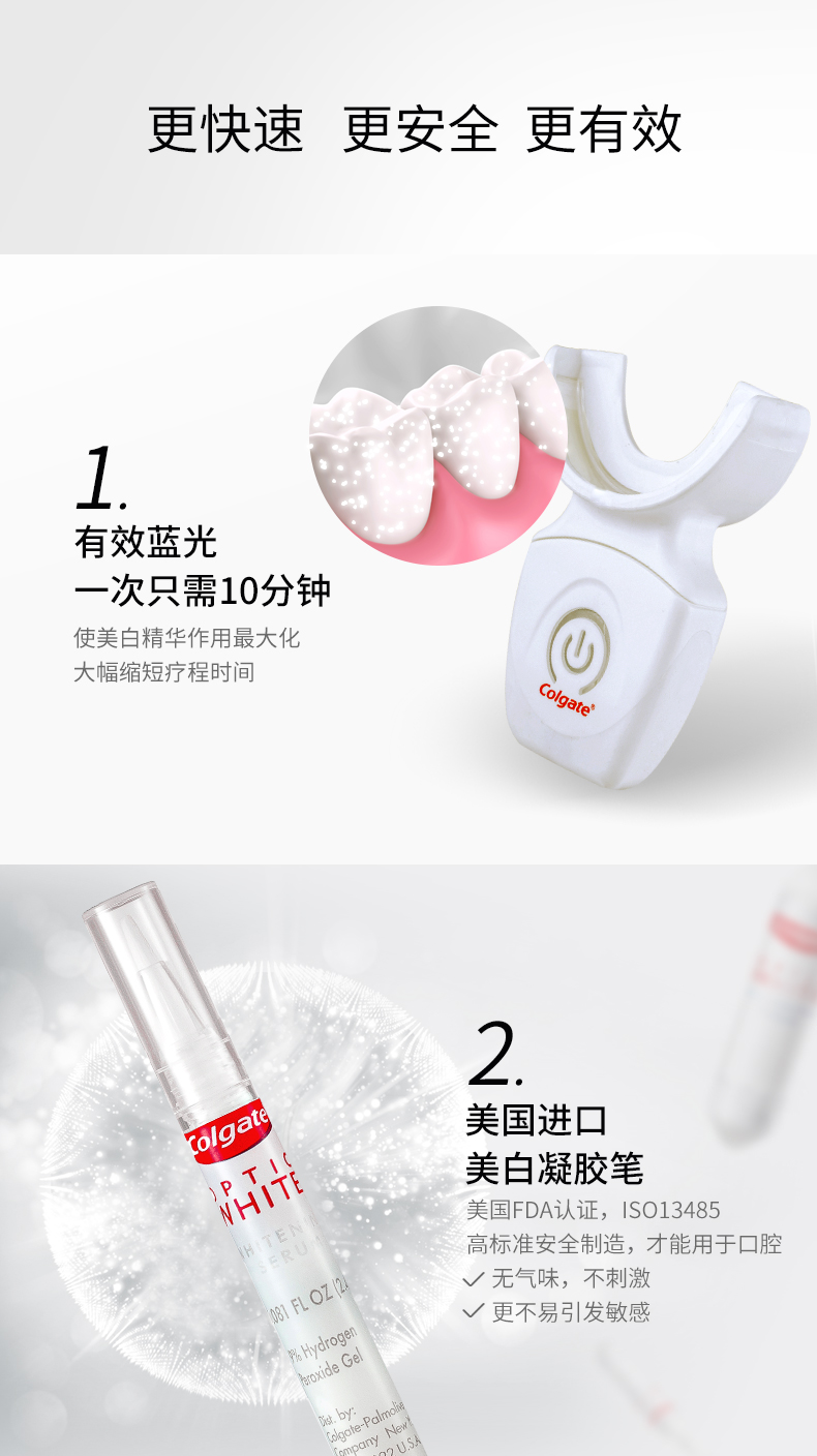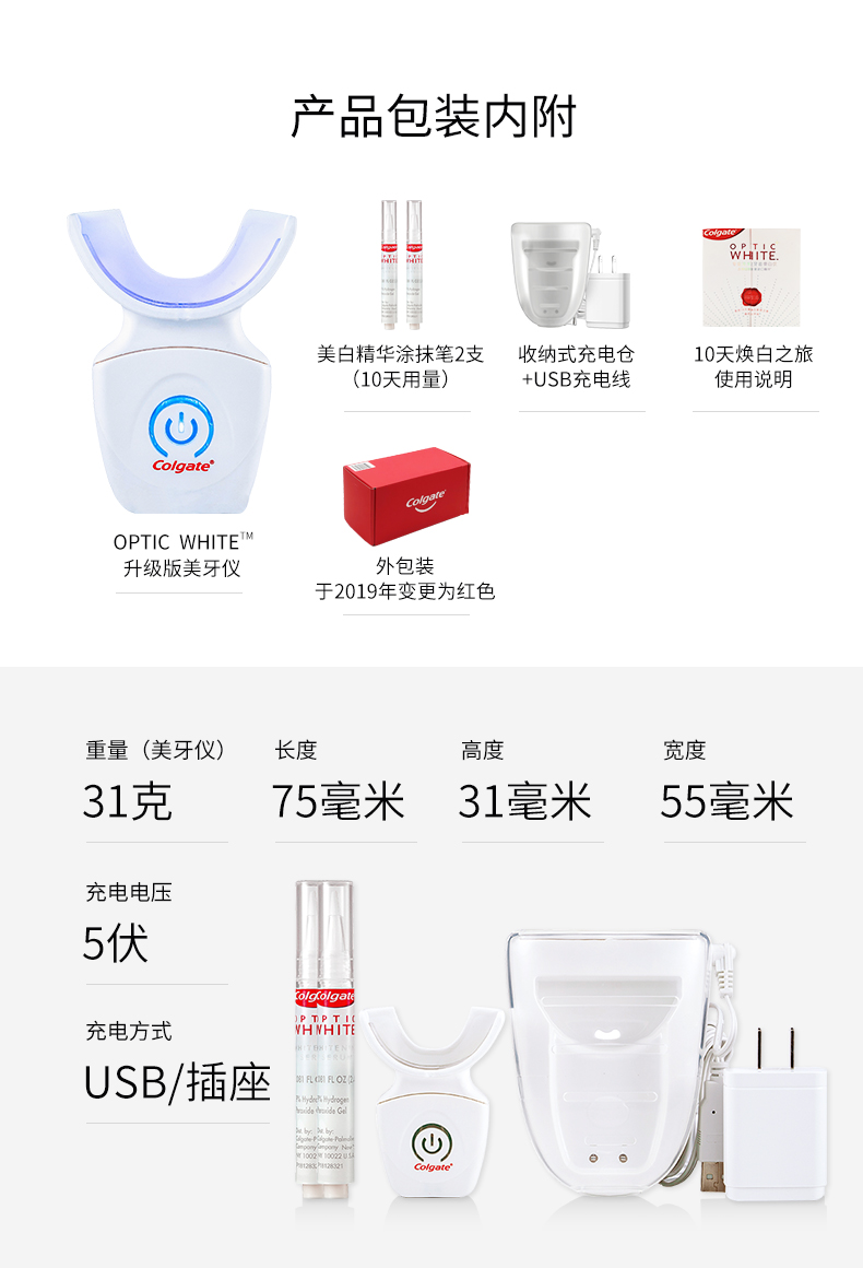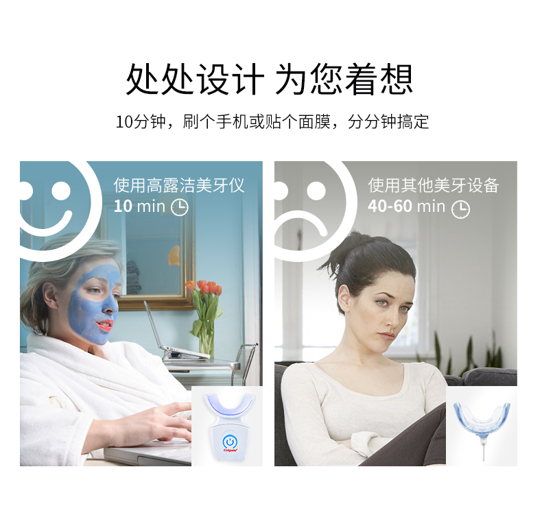 美国进口牙齿美白仪,全新升级第二代,相比第一代,二代机器上去掉了牙龈隔板,使用起来更舒适,凝胶上更换成凝胶笔,可以直接涂抹在牙齿上,更不容易触碰到牙龈更适合亚洲人口腔。套装中带有的是两支凝胶笔,每天使用一次,两支是10-15天的用量,十天为一个周期,连续使用十天效果更佳。使用一个周期一般美白可以保持4-6个月(因抽烟,喝茶饮用咖啡个人习惯问题,使用效果因人而异)