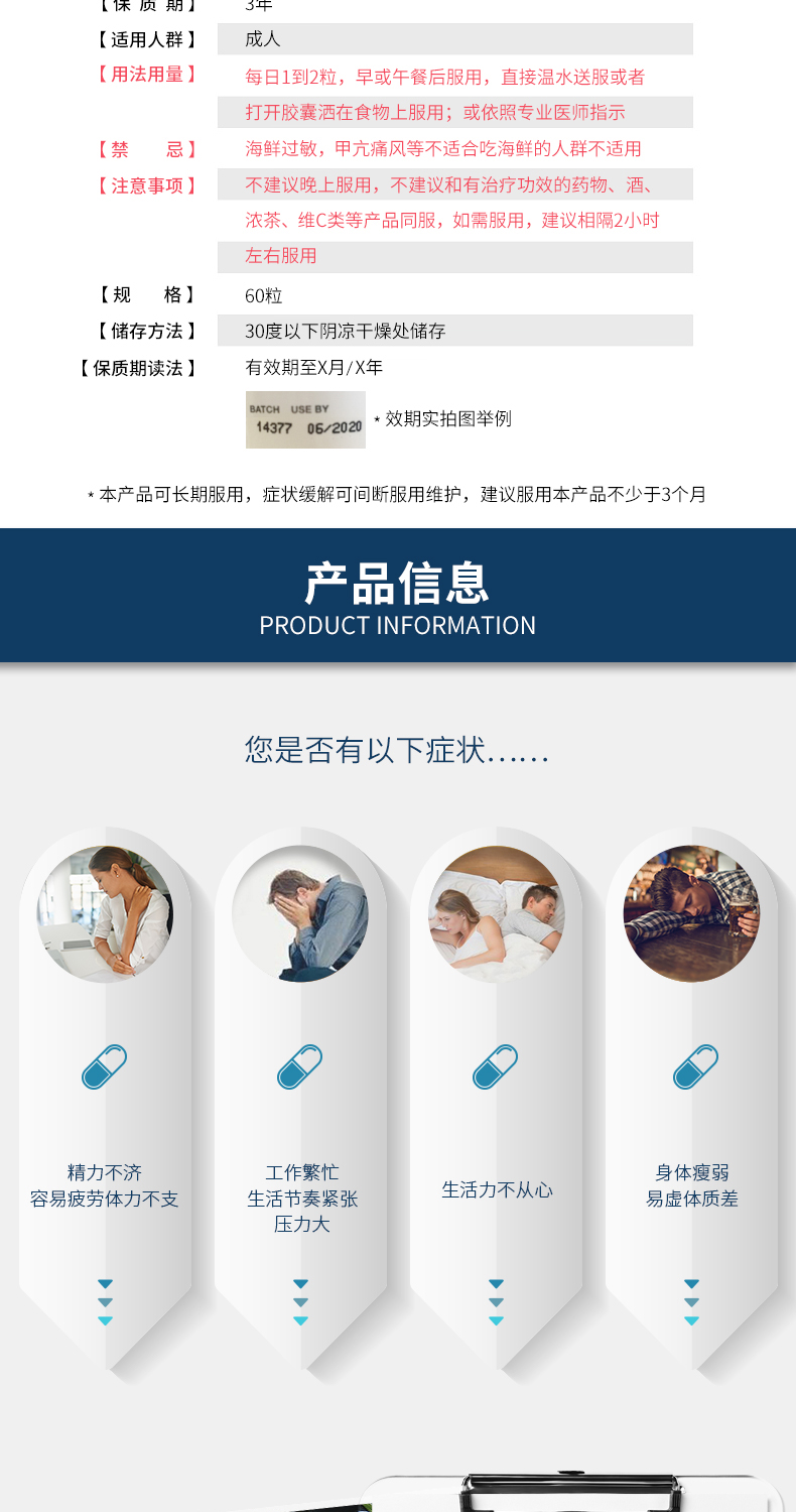 每粒含有350毫克的牡蛎粉,1颗牡蛎胶囊等于7只牡蛎;牡蛎中含有大量的精氨酸与促进额尔蒙分泌的微量元素亚铅,长期服用,可保护生殖系统。