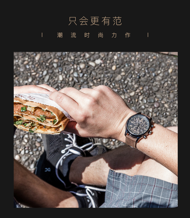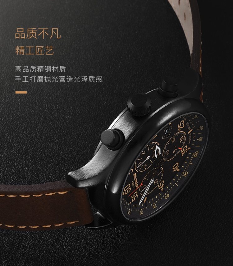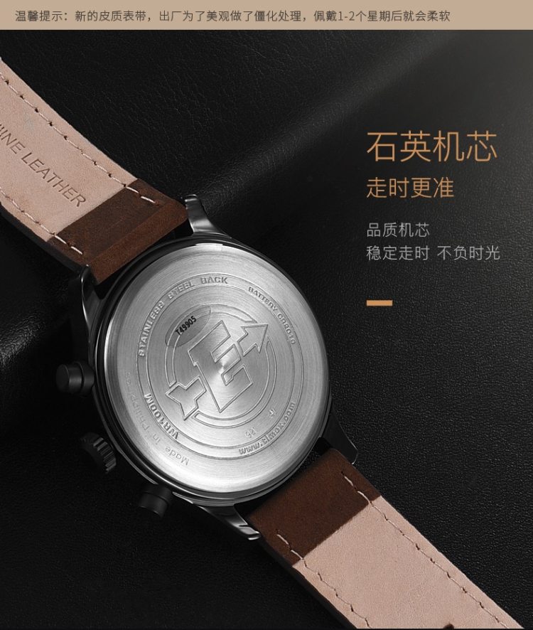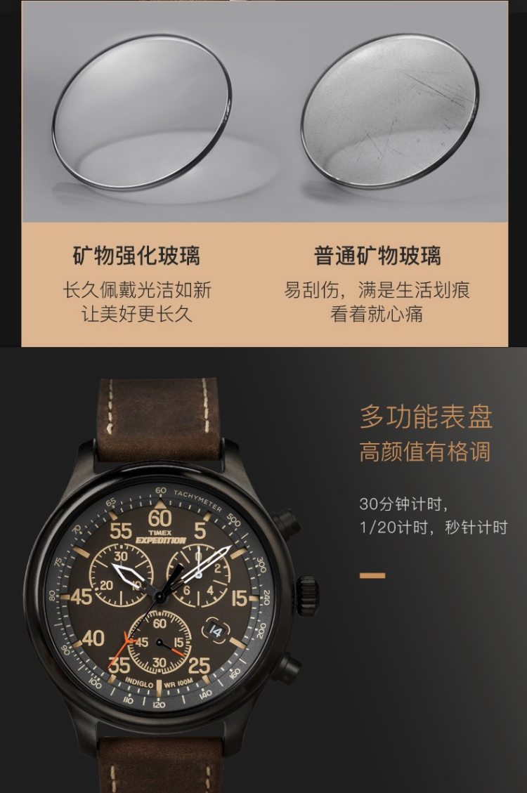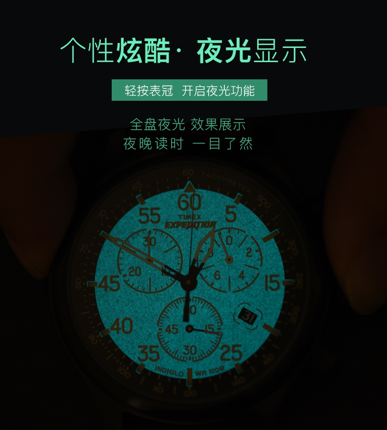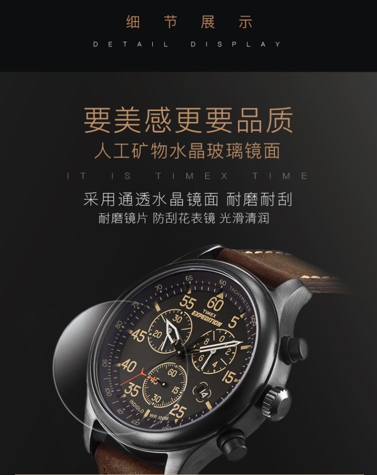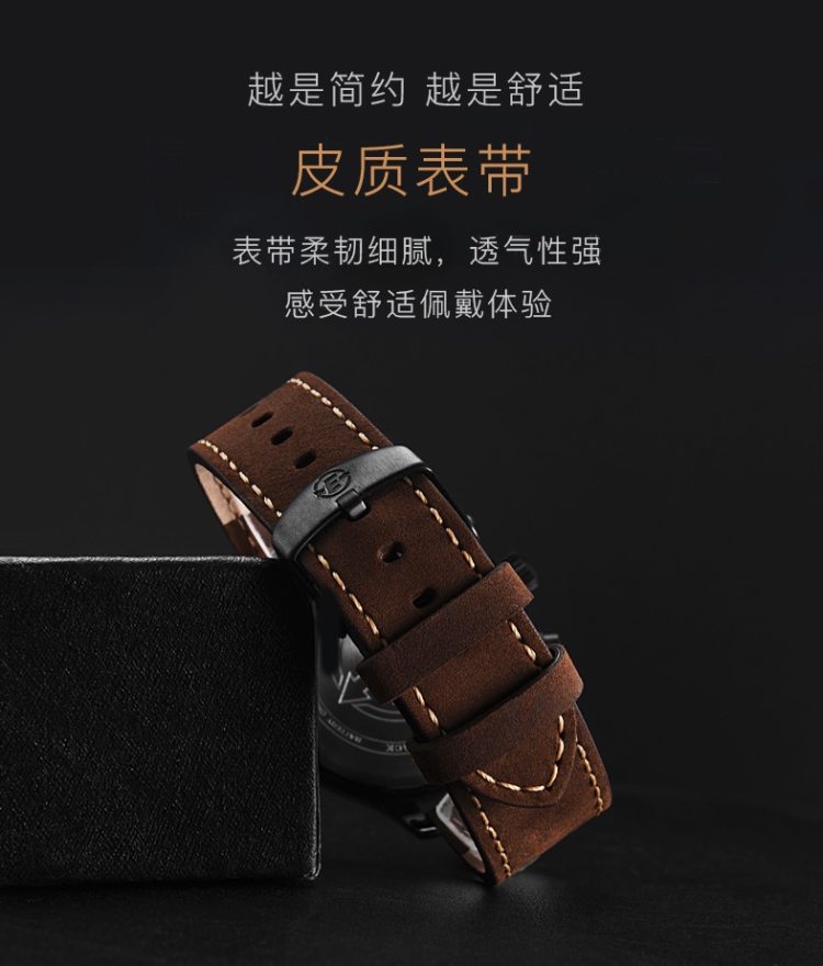 轻按表冠,即可开启全盘夜光功能,夜晚看时间无障碍;表镜采用“高耐磨矿物水晶玻璃”制成,硬度虽稍逊于蓝宝石,抗击打能力却胜于蓝宝石表镜,通透耐磨防刮花;100米防水。