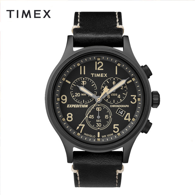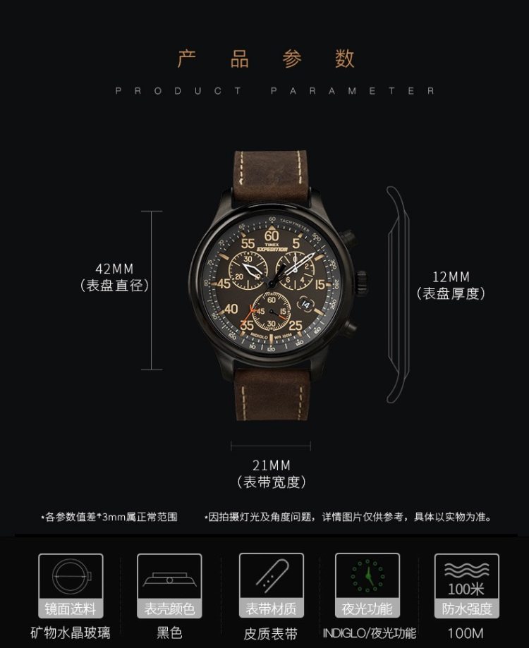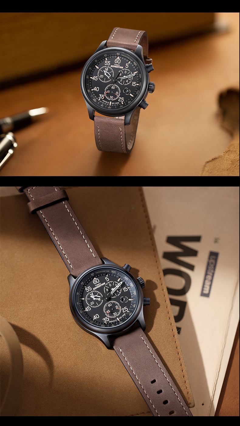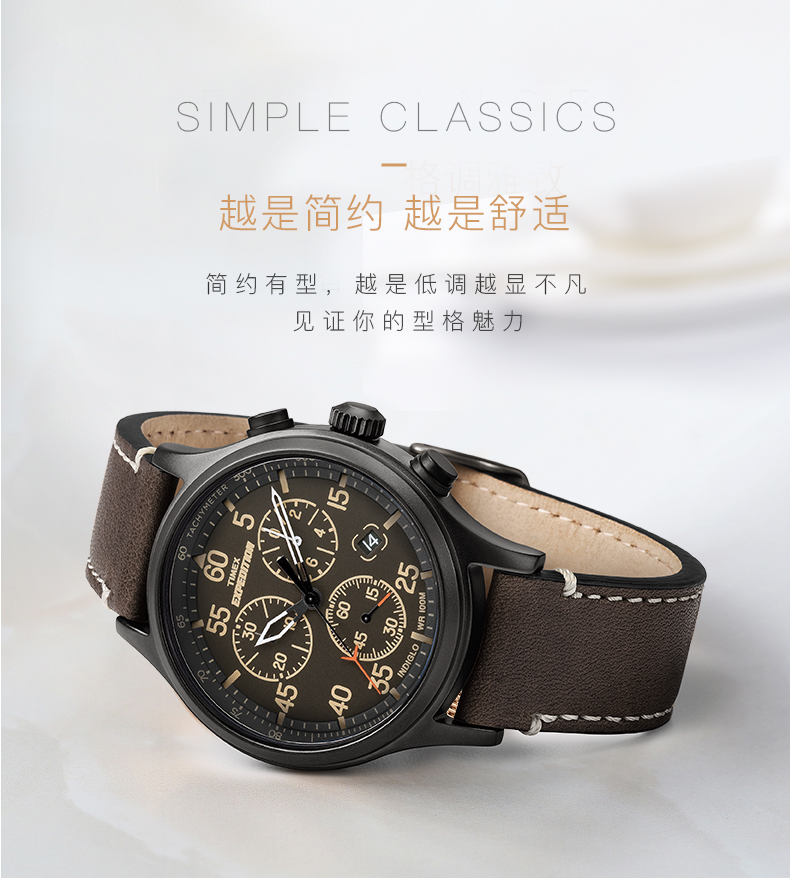 这款天美时 T49905 男户外防水运动腕表,美国原装进口,表盘直径是42mm,厚12mm,大小适中,适合男士佩戴。黑色三眼表盘搭配棕色皮革表带,户外休闲风,三个小表盘分别是30分钟计时、1/20计时、秒针计时;