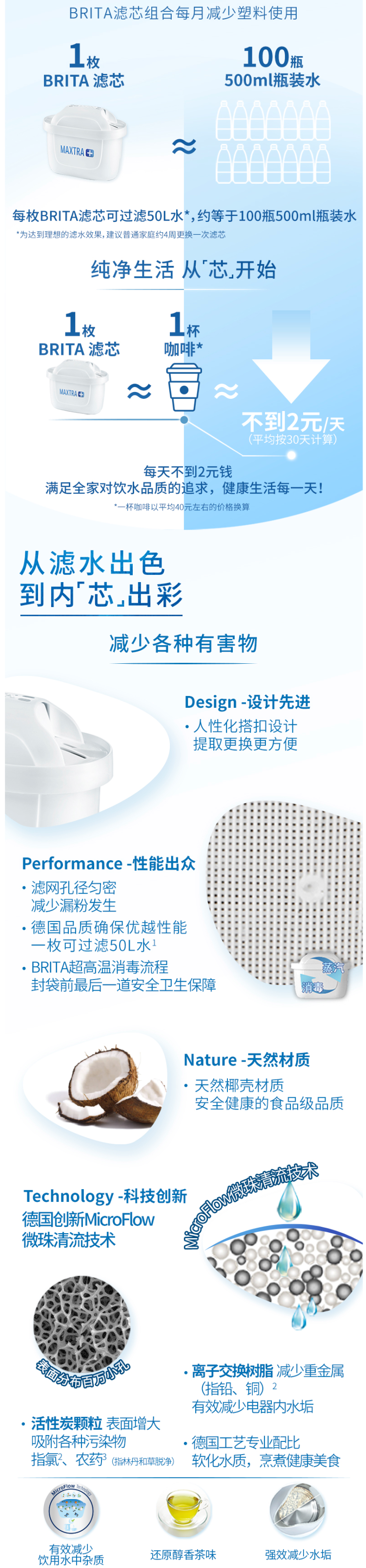 滤芯方面,去水垢加强版滤芯,采用天然椰壳材质制成,安全放心;运用了德国创新MicroFlow微珠清流技术,使水的味道比以往更好。滤芯的Performance性能出众,滤网孔径匀密,减少漏粉的情况发生。