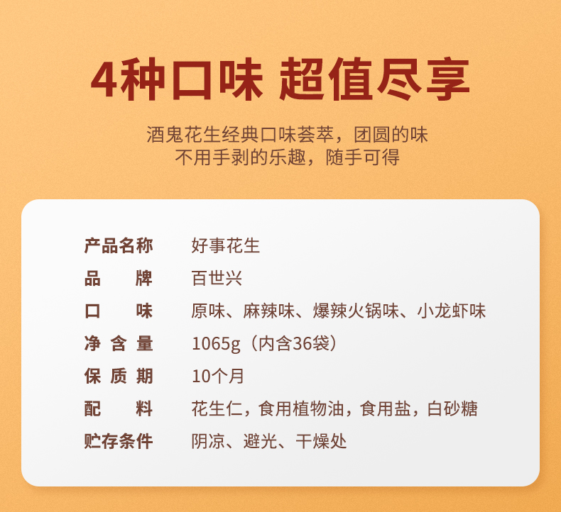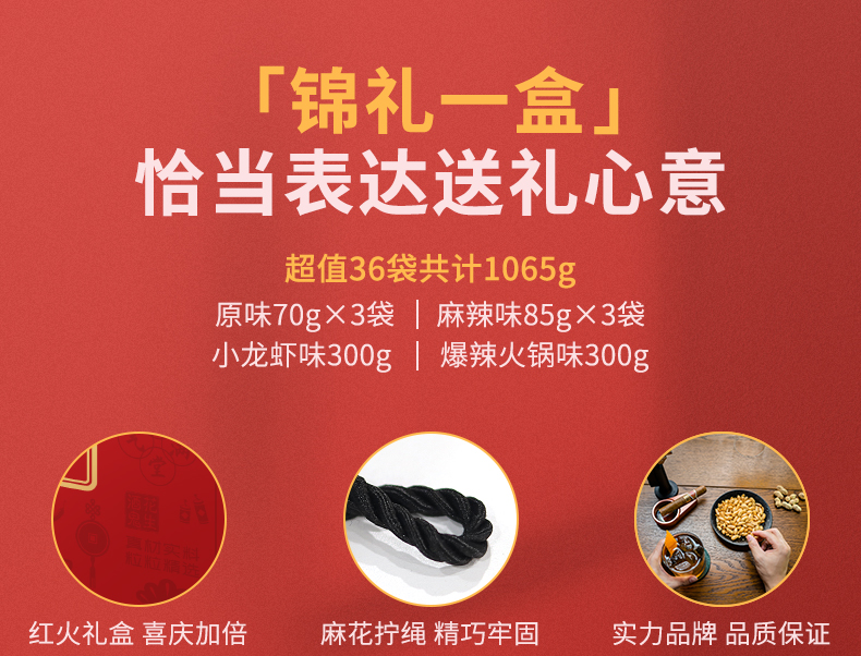 天猫酒鬼食品旗舰店69元,可领10元优惠券,实付59元到手,共36小袋,比超市零买便宜得多。礼盒内包括:原味70g*3袋、麻辣味85g*3袋、小龙虾味300g、爆辣火锅味300g。可以做零食、下酒菜等,精美礼盒装,也适合送礼。规格:1065g。