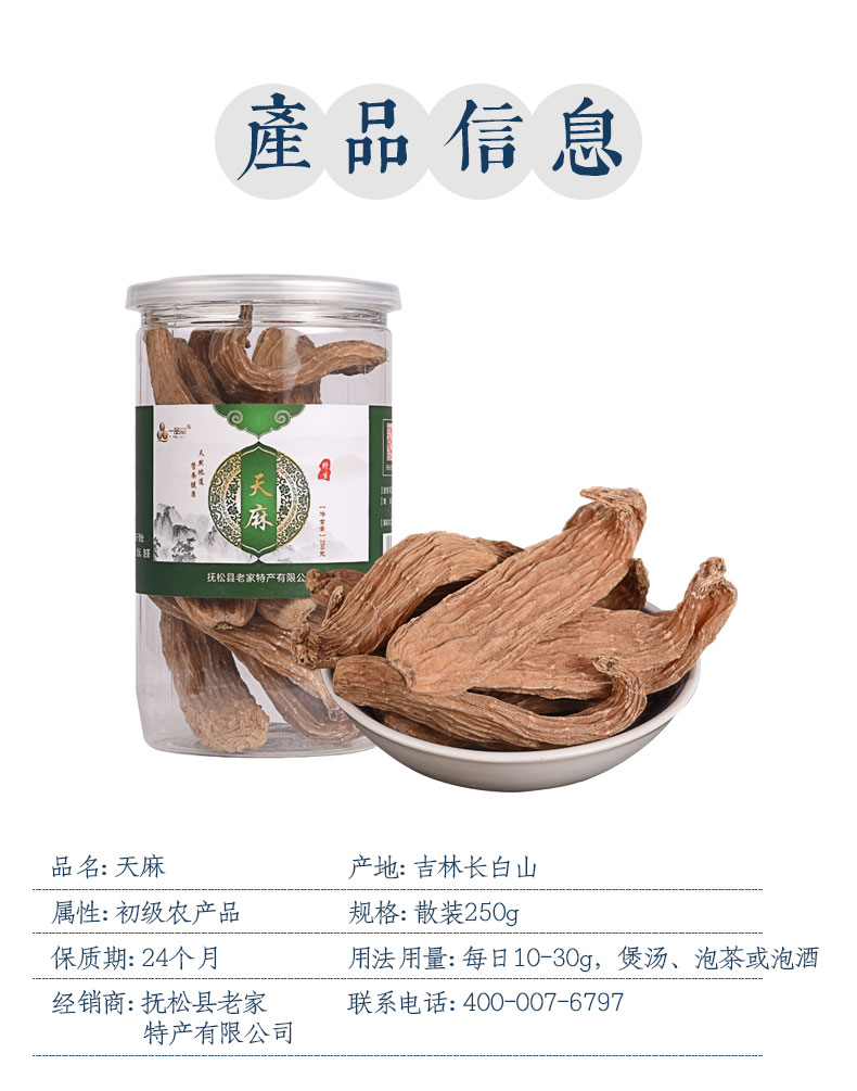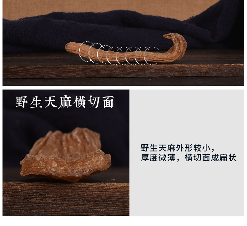 这款一品森天麻产自长白山原始森林,是野生天麻,它的生长周期较长,一般表皮颜色较深,外形较小,厚度微薄,横切面呈扁状,口感微甜。