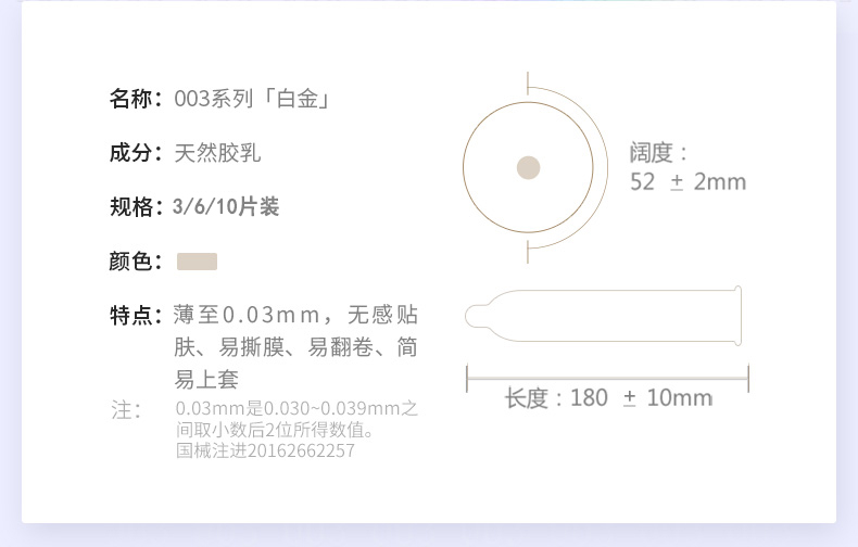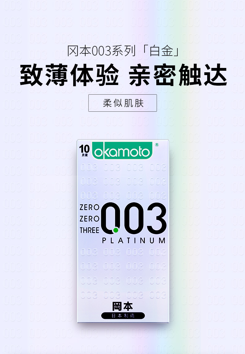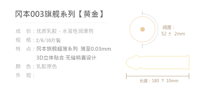 冈本003以薄出名,好用不贵,采用优质乳胶制成,此物料极度坚韧,并含有柔丝剂和软滑剂,可增强天然感觉,就像肌肤一样。易翻卷设计,传热度高,薄然出众,紧致贴合,带来极致性爱体验。