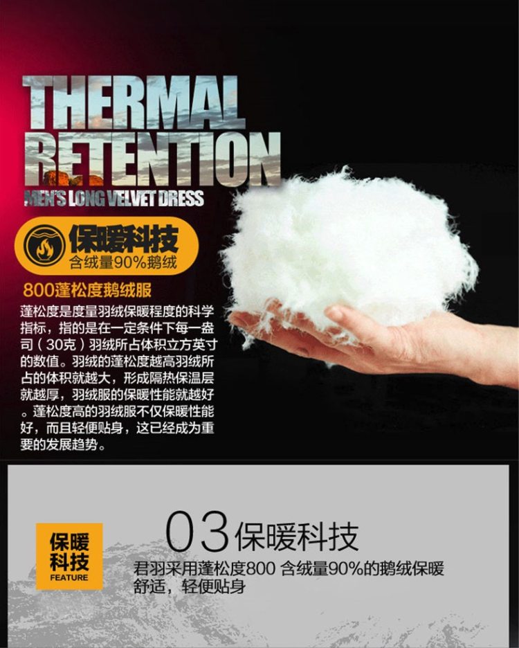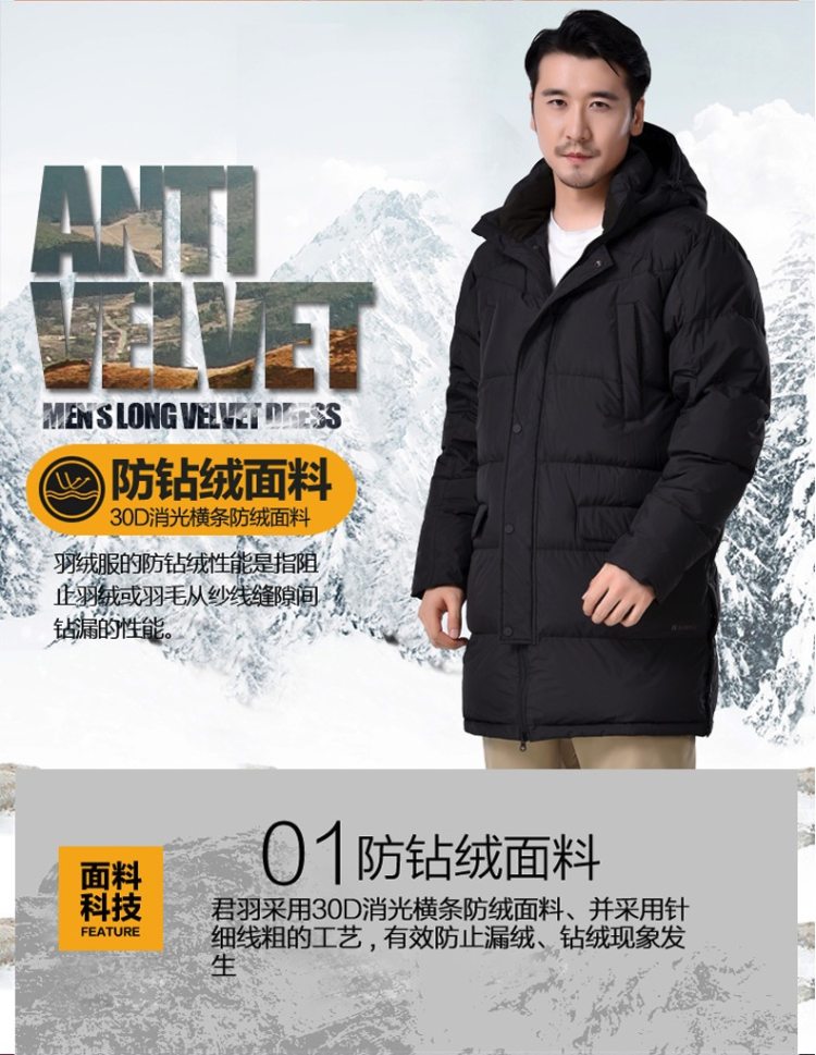 这款君羽寒凛男中长款羽绒服,属于酷寒款,可抗-15℃~-30℃,内里填充了800蓬90%鹅绒,L码充绒量达221克,属于重装羽绒服了额,外层是东丽30D高密度锦纶面料,防风防雨雪。直筒微收腰版型,长度过臀及大腿。