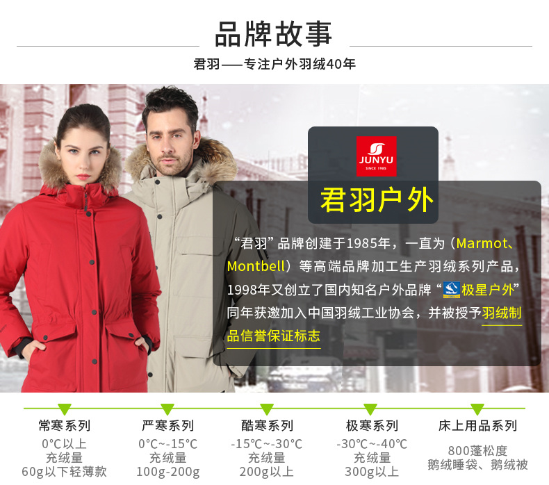君羽创立于1985年,一直为Marmot/土拨鼠、日本Mont-bell等户外大牌代工羽绒服。“君羽”与“极星户外”都是旗下自有品牌,其中“君羽”定位时装,“极星”定位户外服装。极星拥有8000米以上高海拔,和极地羽绒服、羽绒睡袋产品线,曾是中国南极科考队、中国珠峰重测高度队的装备。