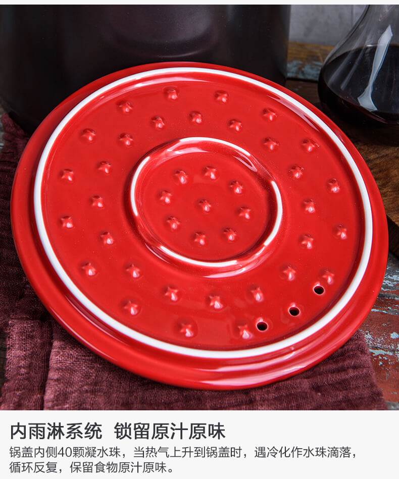 锅盖内部有雨淋系统,内侧有40颗凝水珠,当热气上升到锅盖时,遇冷化作水珠滴落,循环反复,保留食物的原汁原味。