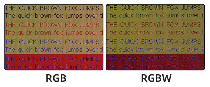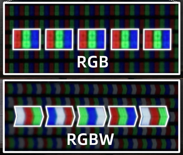 ▲RGB是真4K,总像素830万,RGBW多了W“白色”像素,白色像素不显色,只是为了让屏幕更亮,也更省电,但这是目前最低成本的方案。