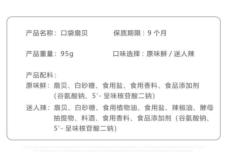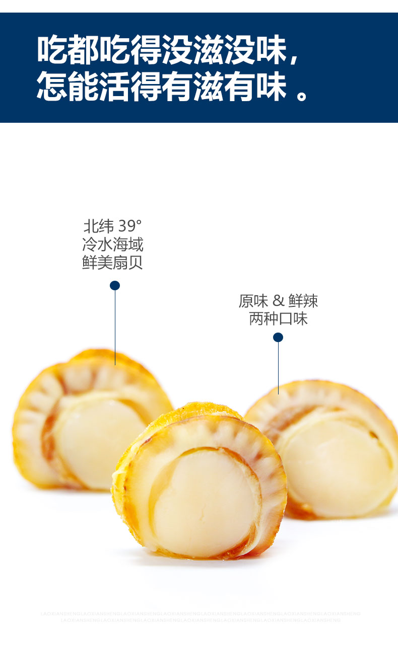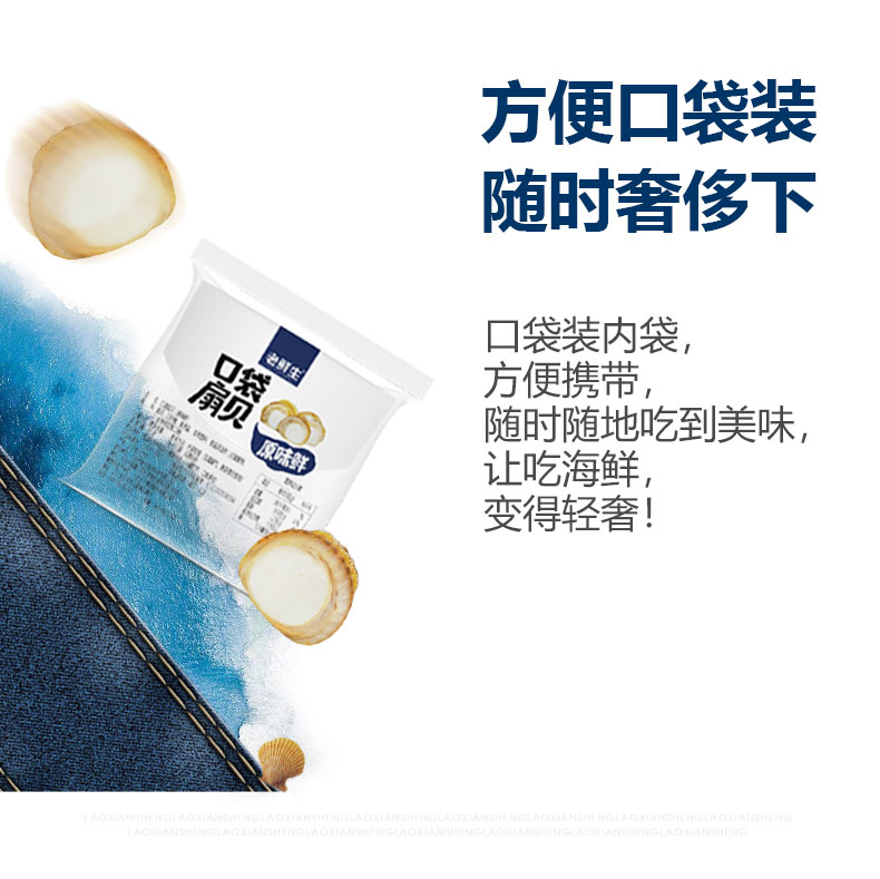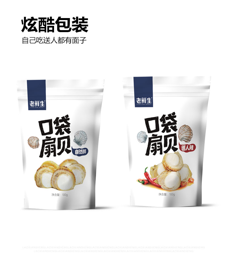 专为休闲时设计的口袋扇贝,优选北纬39°的冷水海域扇贝,去壳去内脏,原味和鲜辣两种口味,鲜美不腥气,入口无沙,小号的口袋装内袋,携带方便,随时随地吃海鲜。