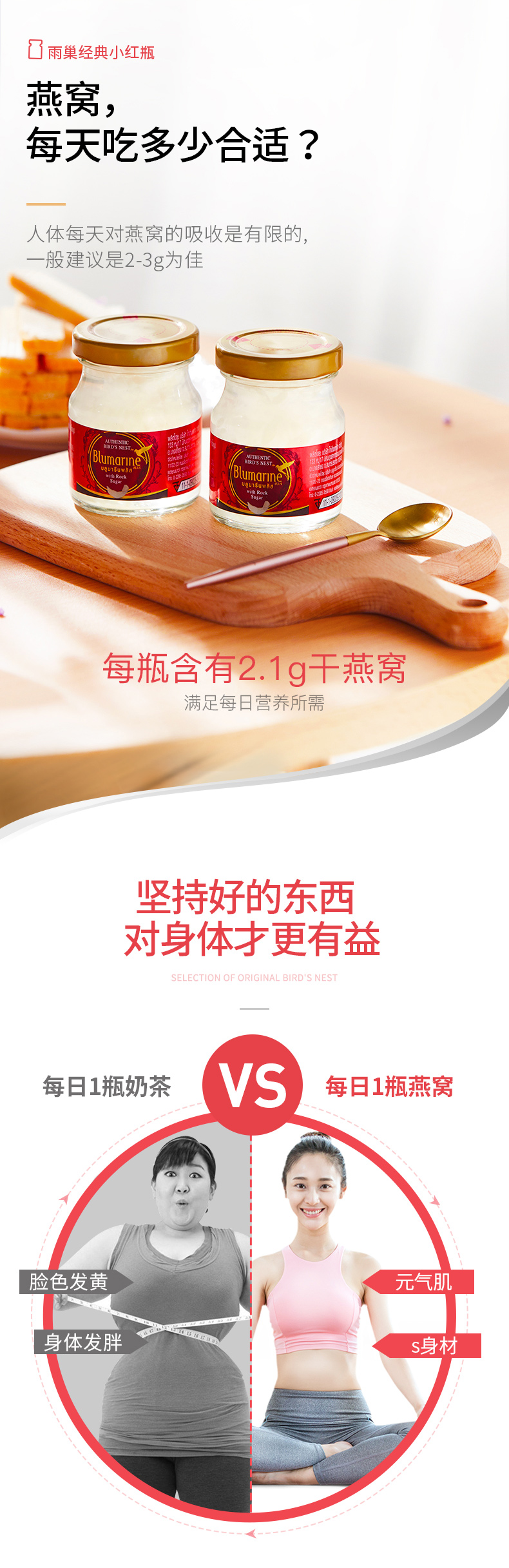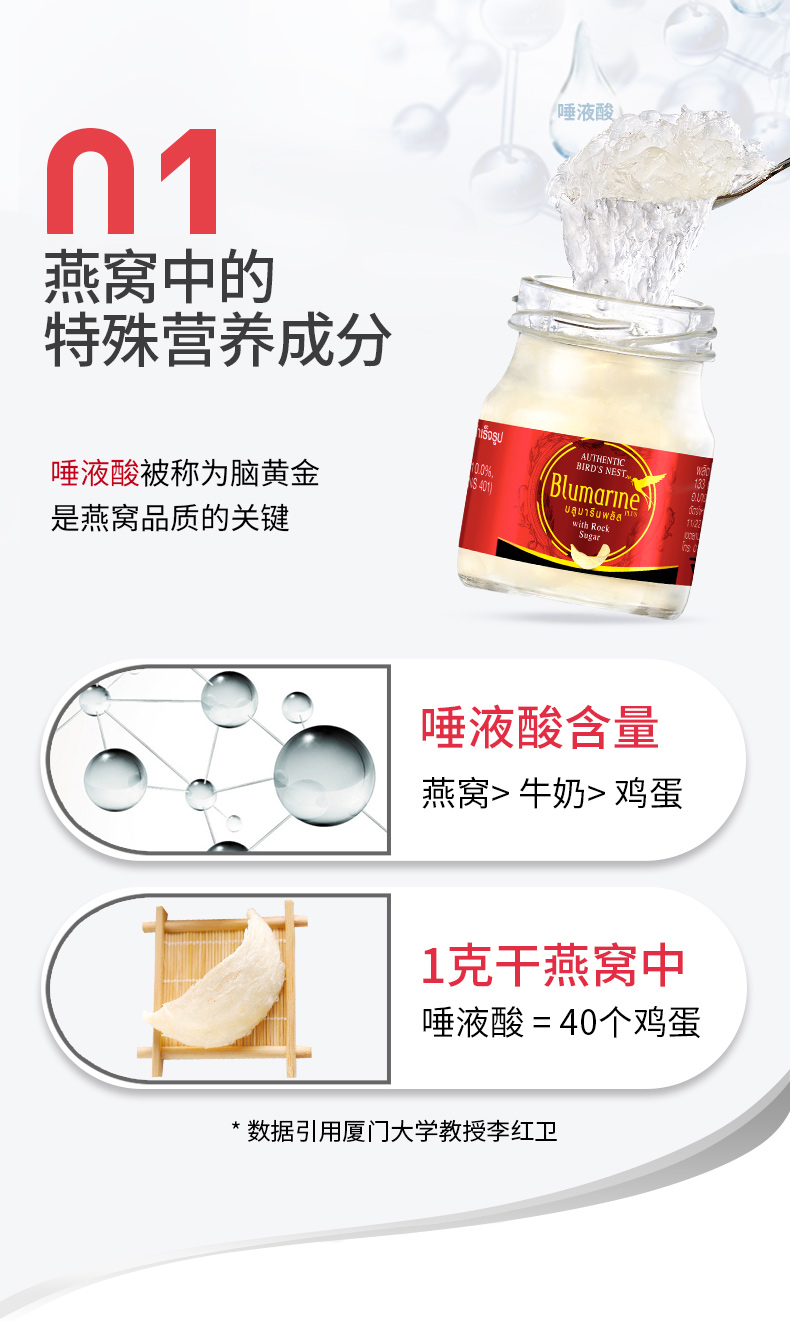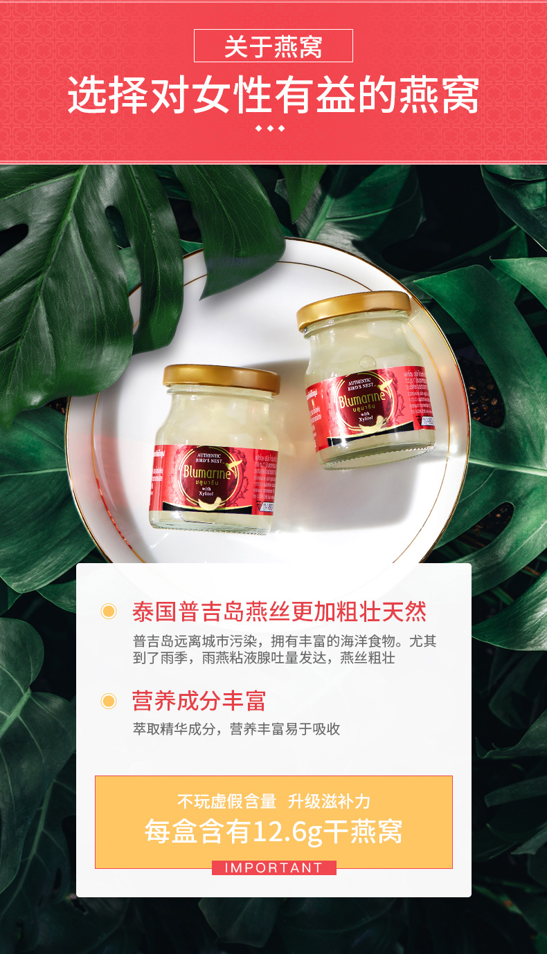 规格:75ml*6瓶/件。每盒约12g干燕窝。Blumarine 即食冰糖燕窝,选用产泰国吉岛自有生态燕房群,3次手工挑毛,121℃的温控杀菌制成,高压封口,无菌保鲜,不添加防腐剂,开盖即食。