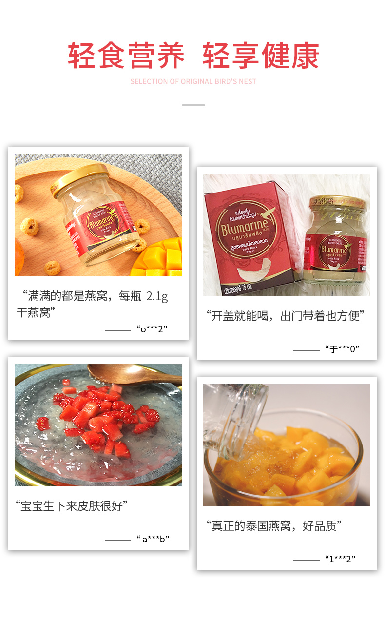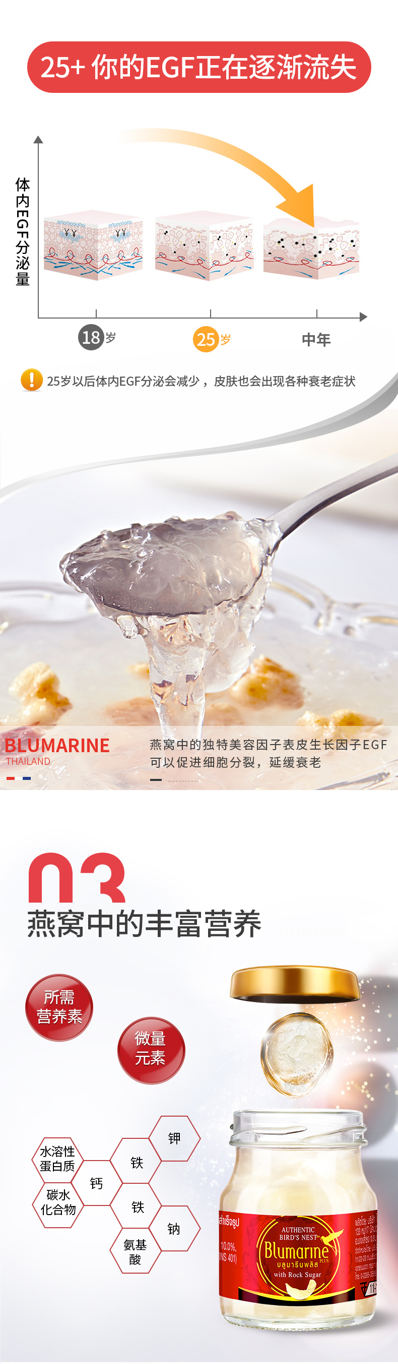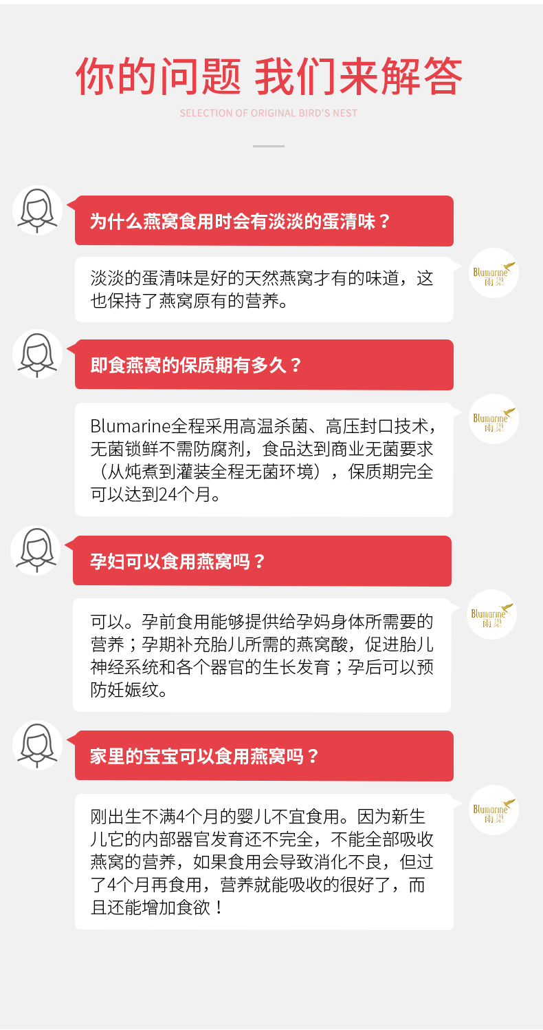 规格:75ml*6瓶/件。每盒约12g干燕窝。Blumarine 即食冰糖燕窝,选用产泰国吉岛自有生态燕房群,3次手工挑毛,121℃的温控杀菌制成,高压封口,无菌保鲜,不添加防腐剂,开盖即食。