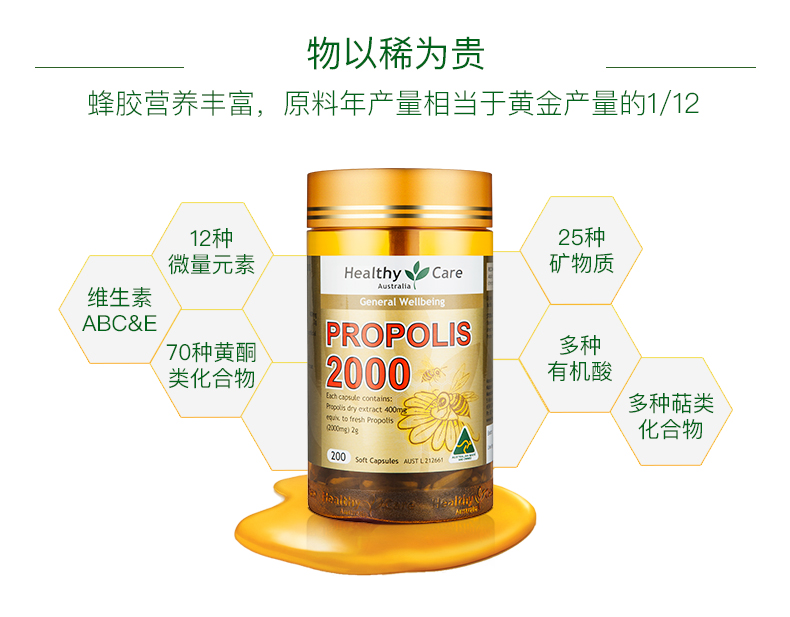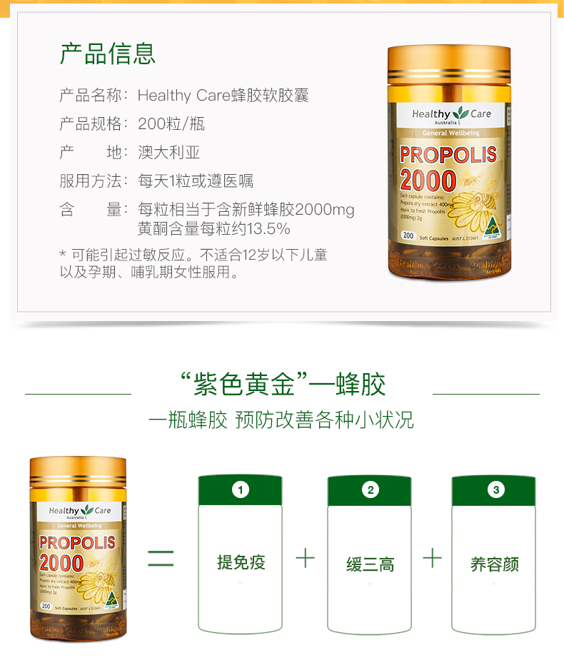 天猫HealthyCareAustralia海外旗舰店139元,可领20元优惠券,实付119元到手,这款Healthy Care黑蜂胶软胶囊,澳洲原装进口,每粒胶囊相当于蜂胶2000mg,黄铜含量每粒约13.5%,相比普通蜂胶含量更高,营养更丰富,通过了澳洲药物管理局TGA认证,规格是200粒,每日1粒。不适合12岁以下儿童、孕期以及哺乳期妇女。