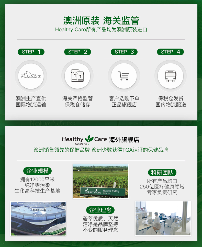 Healthy care是Nature's Care公司旗下的高端保健品品牌,只在澳洲最大连锁药房销售。Nature’s Care Australia是澳洲最大的保健品、护肤生产厂家之一,是澳洲第一家获得TGA认可的cGMP健康食品护肤品厂。