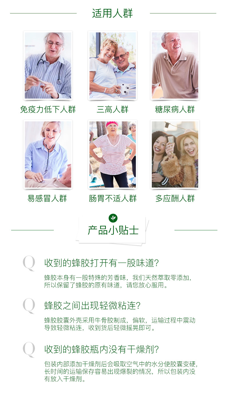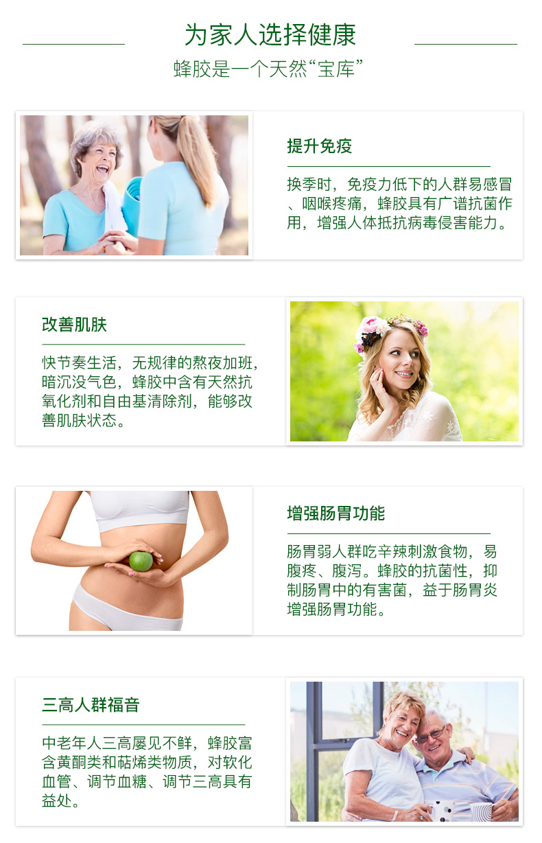 蜂胶是一种“天然抗生素”,能增强天然免疫力,对患慢性炎症、免疫力低下者常用有益;蜂胶有很好的抗氧化、清除自由基作用,并有消炎、排毒、改善循环、调节内分泌、促进再生,因此可以营养肌肤,延缓衰老;此外,蜂胶对心血管病也有预防作用,能降低血脂、软化血管、改善循环、适合于高血压,高血脂、动脉硬化、冠心病等。