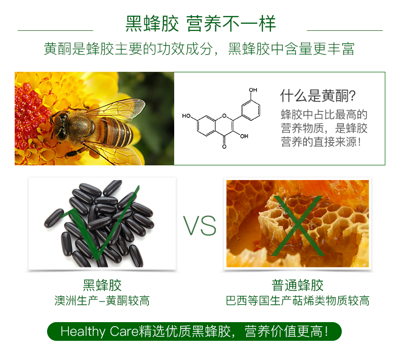 澳洲黑蜂胶产量稀少,内含20大类共300余种营养成分。代表性的活性物质是黄酮类化合物中的槲皮素、萜类及有机酸中的咖啡酸苯乙酯,蜂胶是不可多得的珍贵营养物质。