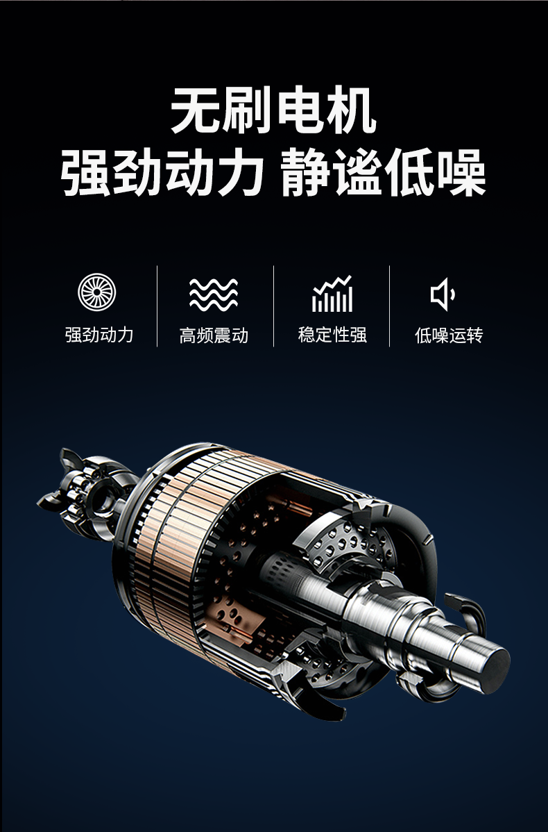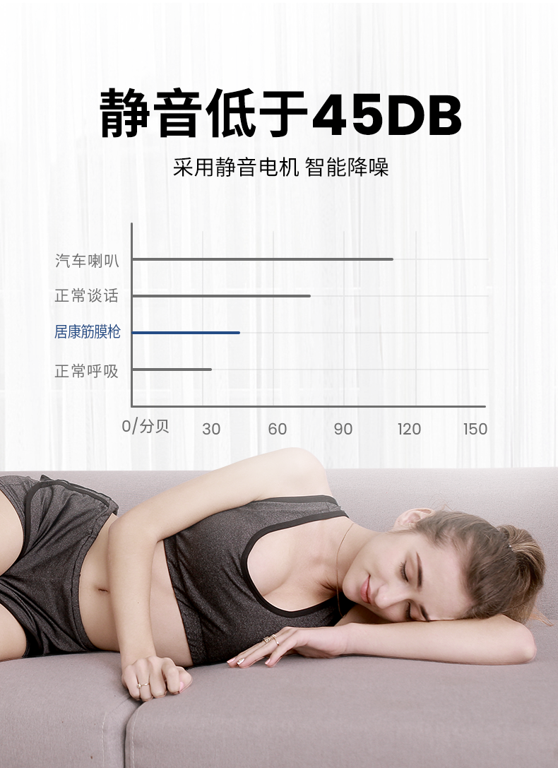 这款按摩抢使用高扭矩的大功率无刷电机,持久耐用,无摩擦,寿命长,最高3200转/分钟的击打速度,强劲有力,不会因为外力的影响而减速,直击肌肉深层,缓解肌肉酸痛。使用时的噪音仅45db,静音不扰人。