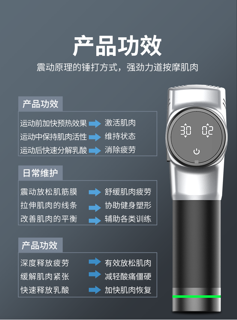 肌肉酸痛已经成为当今普遍产生的问题,很多人群由于长期坐姿办公导致局部肌肉劳损酸痛,健身训练人群也会产生肌肉酸痛,按摩枪可以针对不舒适肌肉区域进行针对性放松按摩,缓解身体的不舒适。