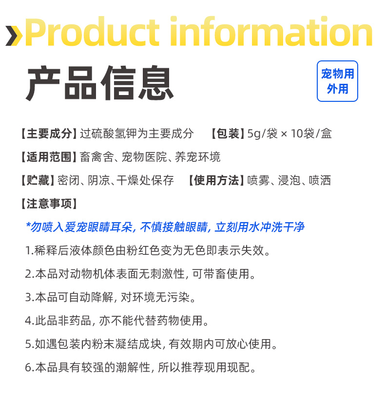 适用于宠物医院、宠物美容、宠物店寄养、养宠家庭、专业犬舍猫舍及小动物等的消毒。规格是5g*10袋。