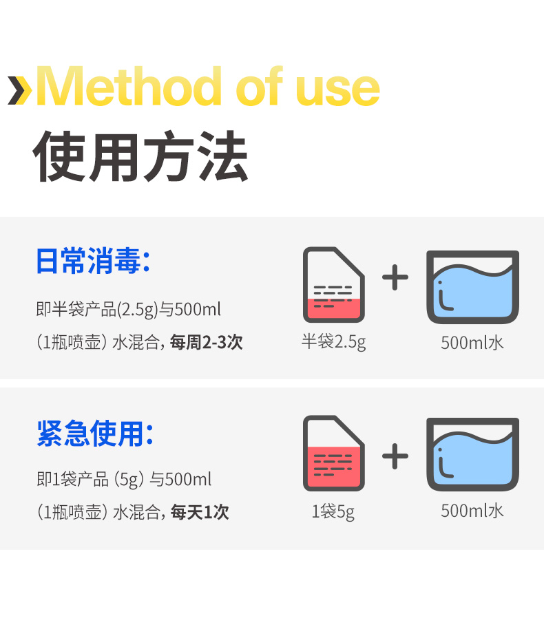 使用方法,日常消毒:半袋产品(2.5g)与500ml(1瓶喷壶)水混合,每周2-3次;紧急使用:1袋产品(5g)与500ml(1瓶喷壶)水混合,每天1次;