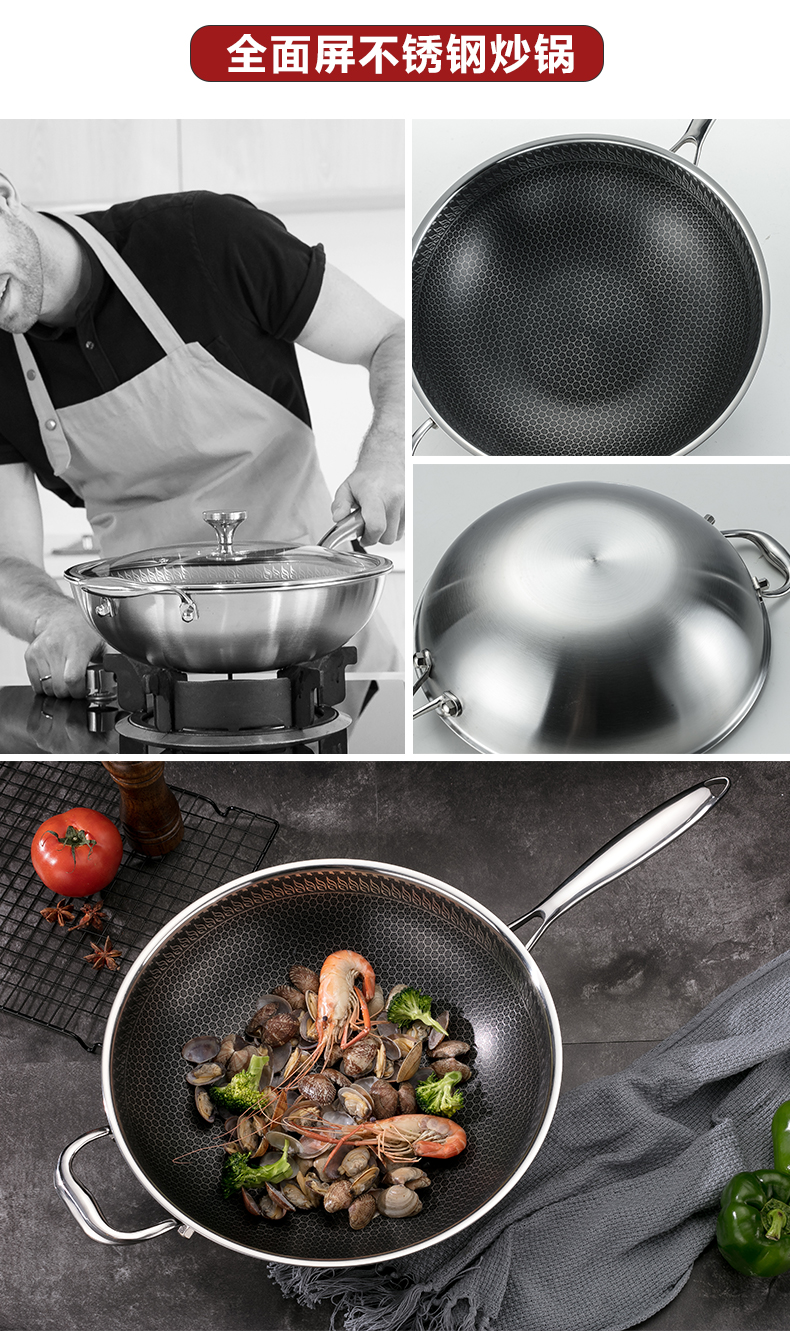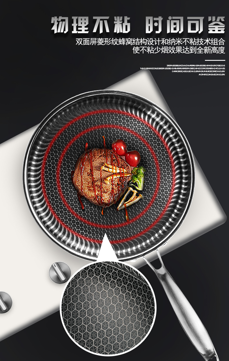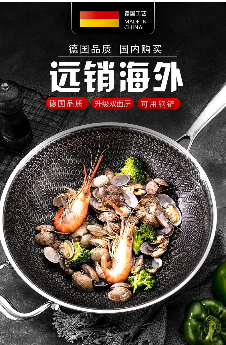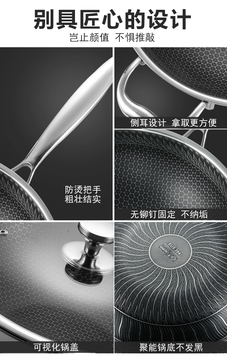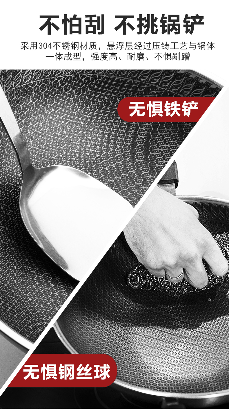 这款杭泰不粘炒锅,采用德国工艺制成,锅体为食用级304不锈钢复合材质,锅内为蜂窝纹理设计,物理不粘,无涂层不怕剐蹭,且少油烟。7层钢一体压铸锅体,受热均匀而迅速,不挑炉灶,电磁炉、燃气灶都能用。