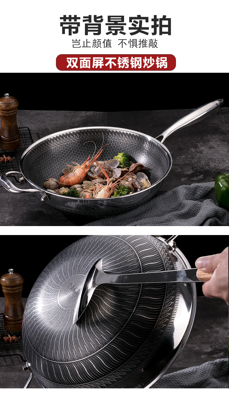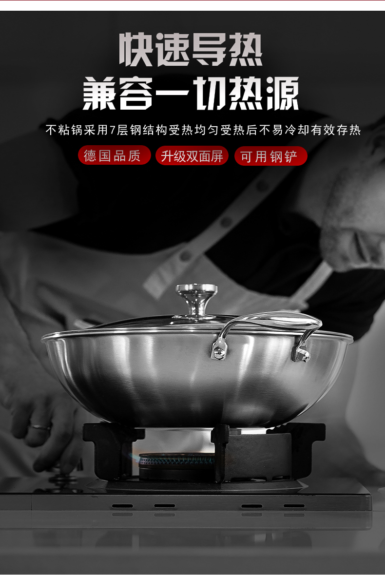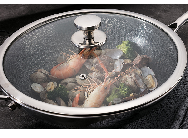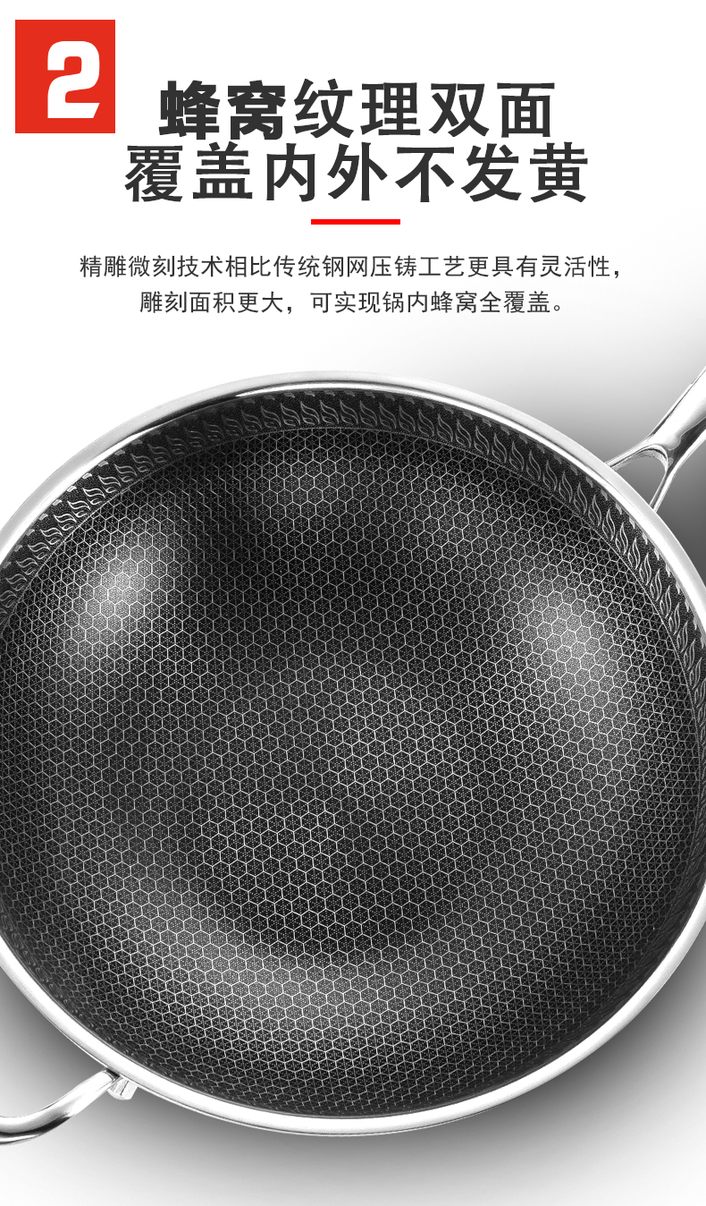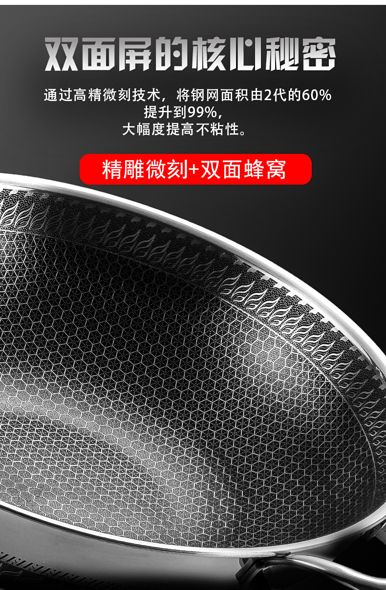 这款杭泰不粘炒锅,采用德国工艺制成,锅体为食用级304不锈钢复合材质,锅内为蜂窝纹理设计,物理不粘,无涂层不怕剐蹭,且少油烟。7层钢一体压铸锅体,受热均匀而迅速,不挑炉灶,电磁炉、燃气灶都能用。