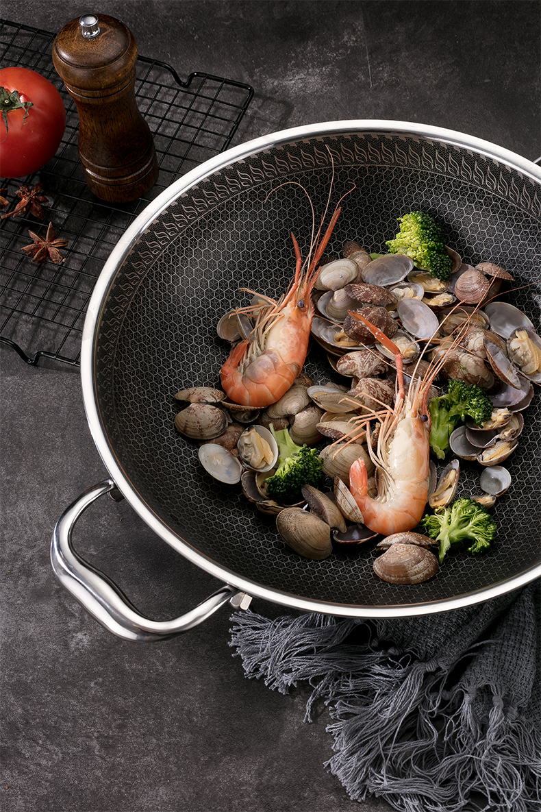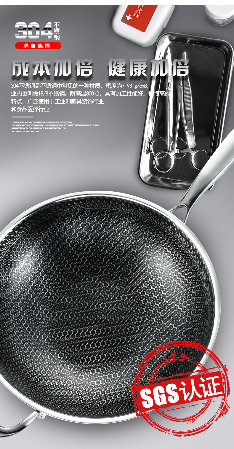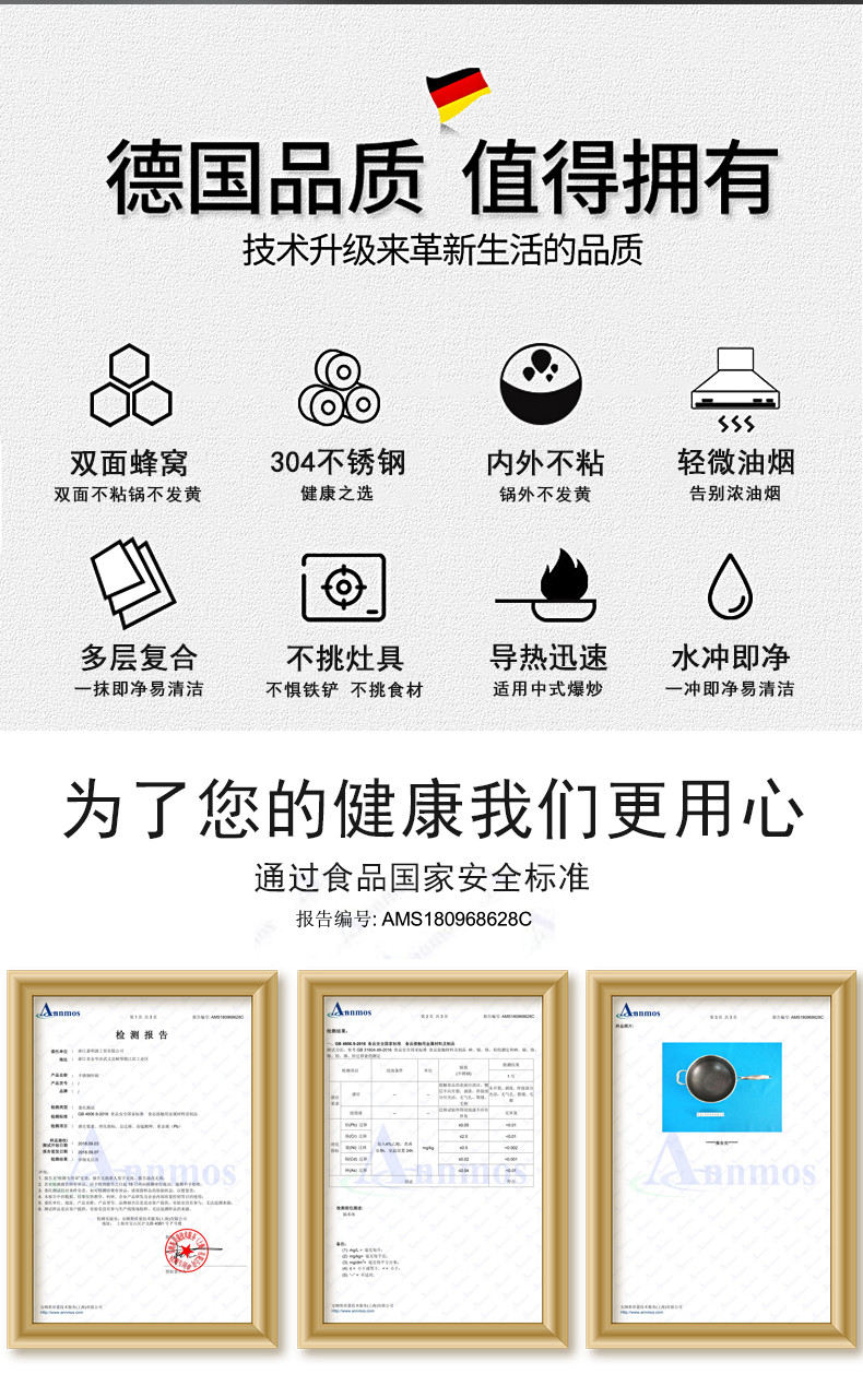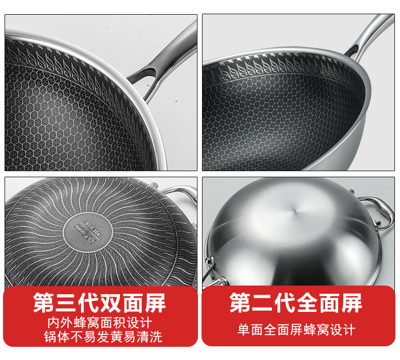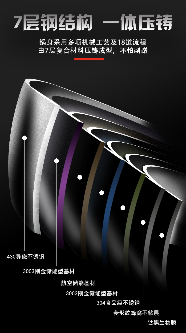 这款杭泰不粘炒锅,采用德国工艺制成,锅体为食用级304不锈钢复合材质,锅内为蜂窝纹理设计,物理不粘,无涂层不怕剐蹭,且少油烟。7层钢一体压铸锅体,受热均匀而迅速,不挑炉灶,电磁炉、燃气灶都能用。