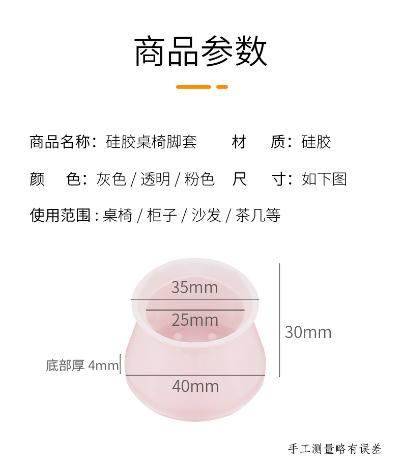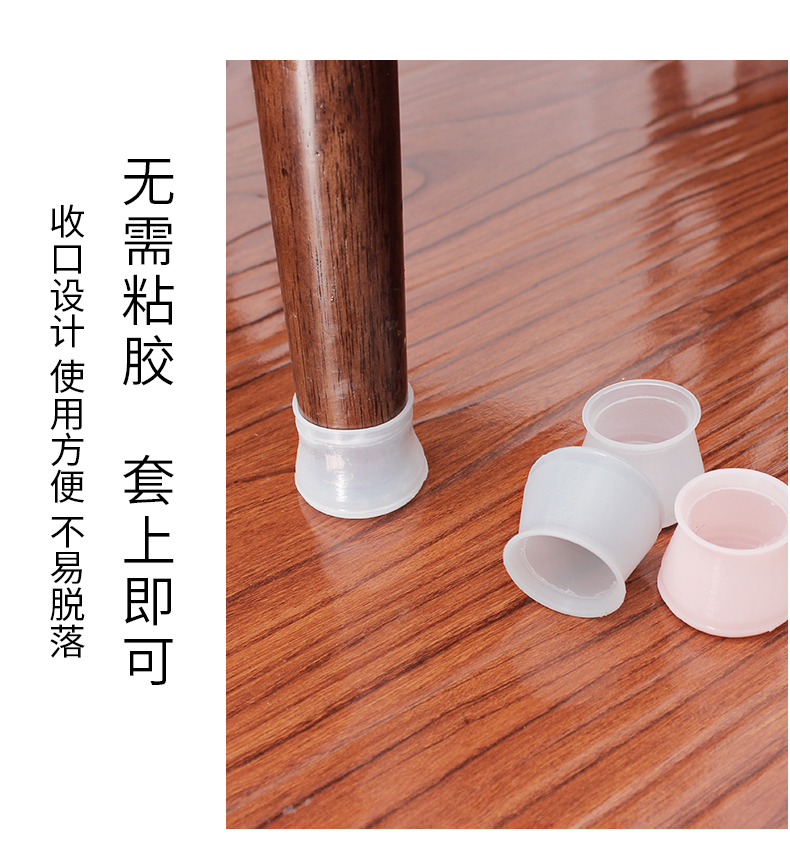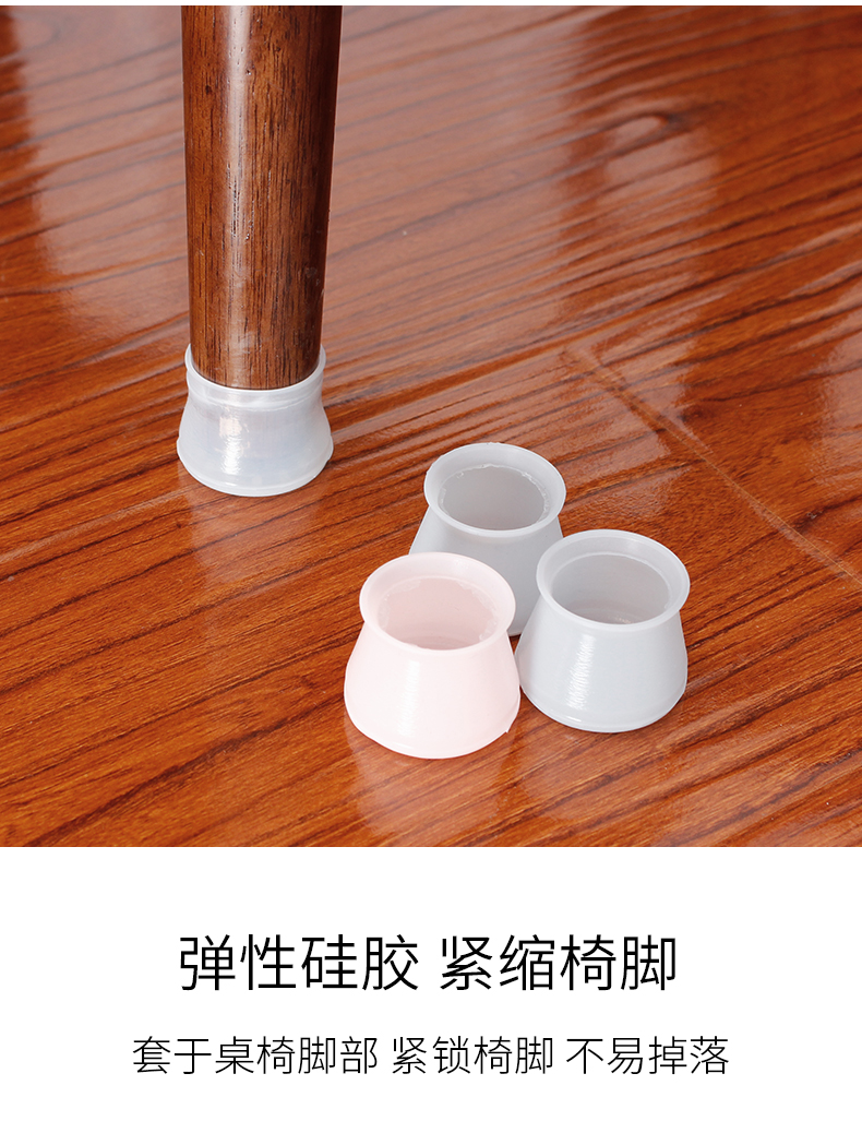 这款硅胶桌腿垫凳子包脚套,弹性硅胶材质,紧锁桌椅脚步,不易掉落,底部加厚耐磨,内含防滑颗粒,有效静音,防止划伤地板,在也不怕孩子硬拉了。适合圆形直径3-5cm、或方形长宽2-4cm左右桌椅脚使用。使用简单方便,一套即可,美观又实用。