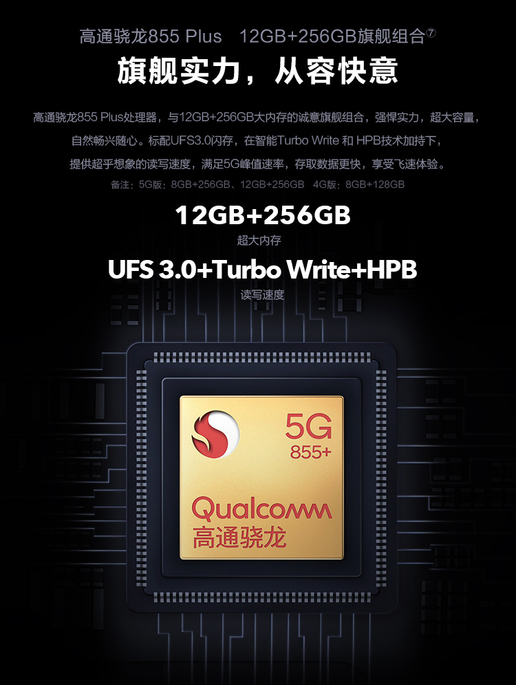 配置方面,搭载高通骁龙855 Plus处理器+X 50基带,支持5G网络。内置4500mAh电池,44W超快闪充。全系标配UFS 3.0内存以及全功能NFC。