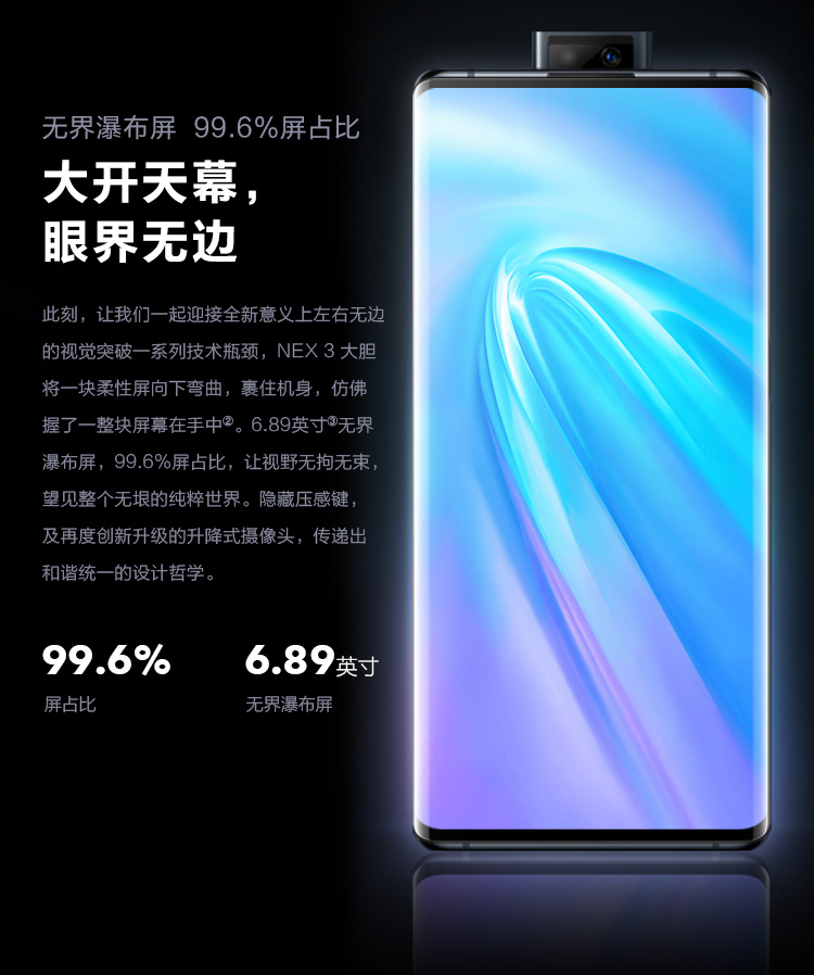 vivo Nex 3,延续了该系列前置升降式摄像头的设计。正面采用6.89英寸柔性屏幕,它的左右两侧的弯折角度接近90度,拥有99.6%的屏占比,官方称之为「无界瀑布屏」。