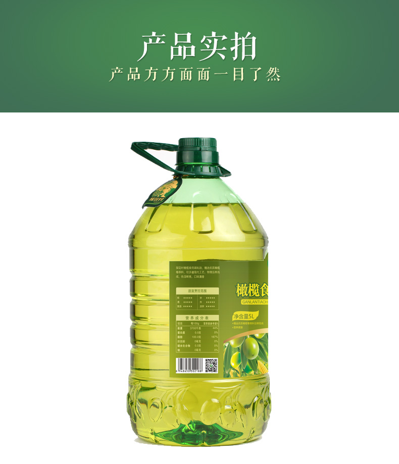 这款是食用调和油,由菜籽油、葵花籽油、油茶籽油、橄榄油调和而成;出口品质,精选优质原料,物理冷榨,颜色清透,健康好口感。