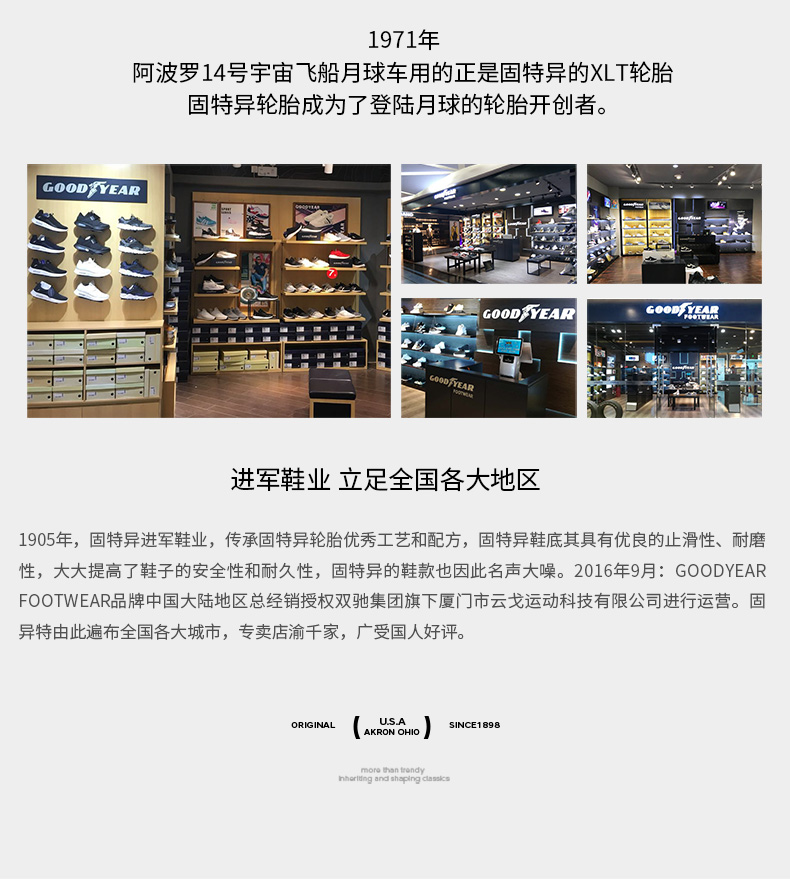 1905年固特异开始做鞋,因为鞋底做的和轮胎一样好,防滑、耐磨、安全耐久,广受好评。2016年9月GOOD YEAR品牌中国大陆地区总经销授权厦门一家公司进行经营,2017年6月10日,固特异中国第一家鞋品店于北京王府井正式开业,现在专卖店超过1000家。