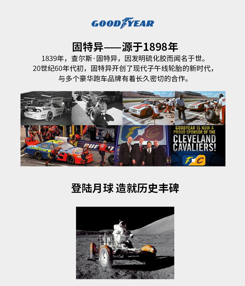 美国固特异轮胎橡胶公司始建于1898年,至今已有百余年的历史。固特异公司是世界上最大规模的轮胎生产公司,1971年阿波罗14号宇宙飞船月球车用的正是固特异的XLT轮胎。现今与多个豪华跑车品牌均保持密切合作。