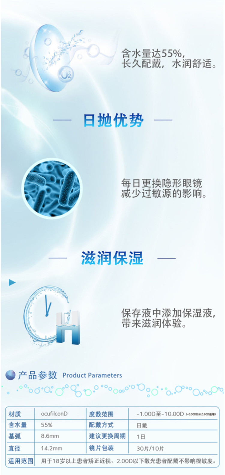 低镜片设计,减少眨眼间与镜片的摩擦,有效降低异物感,增加瞬目的舒适度;镜片边缘采用干式膜铸工艺,使表面更加光滑,成形性好,更易于操作,对初期佩戴者尤其方便。规格30片。