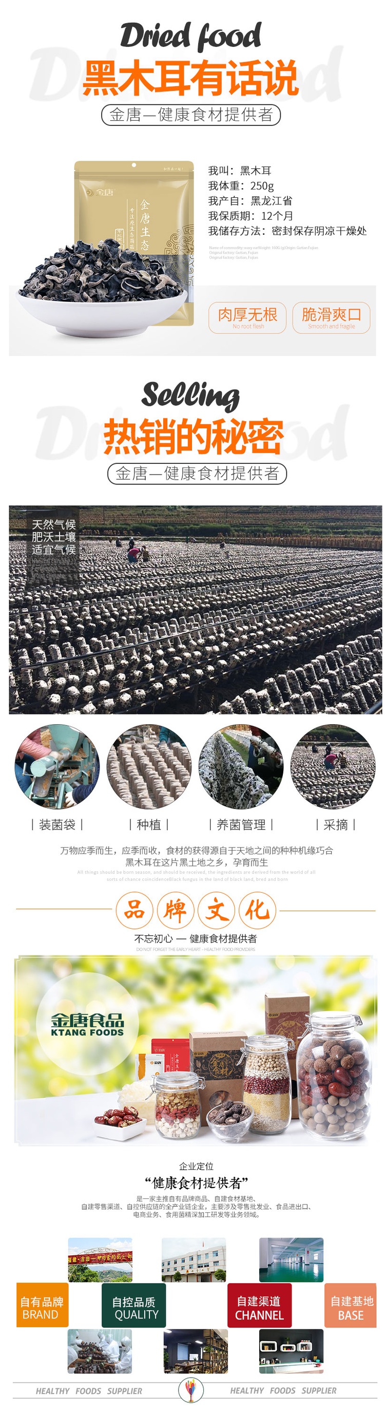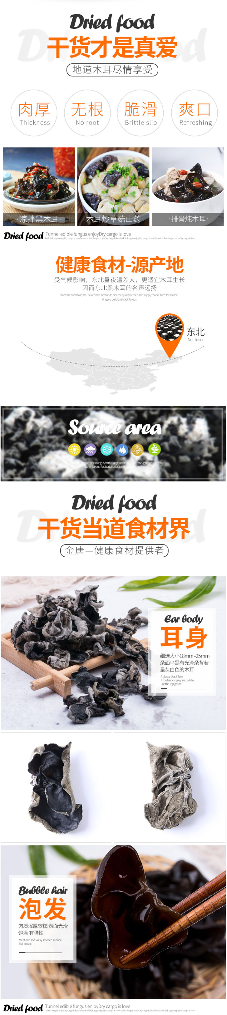 这款金唐野生东北黑木耳,品种是牡丹江木耳,野生种植,无激素化肥农药,纯有机纯天然。木耳在采摘后人工剪根去除杂质,木耳的朵型完整,脉络清晰,经过自然晾晒、黑褐色透亮,晶莹剔透,泡发后耳片肥硕有肉。