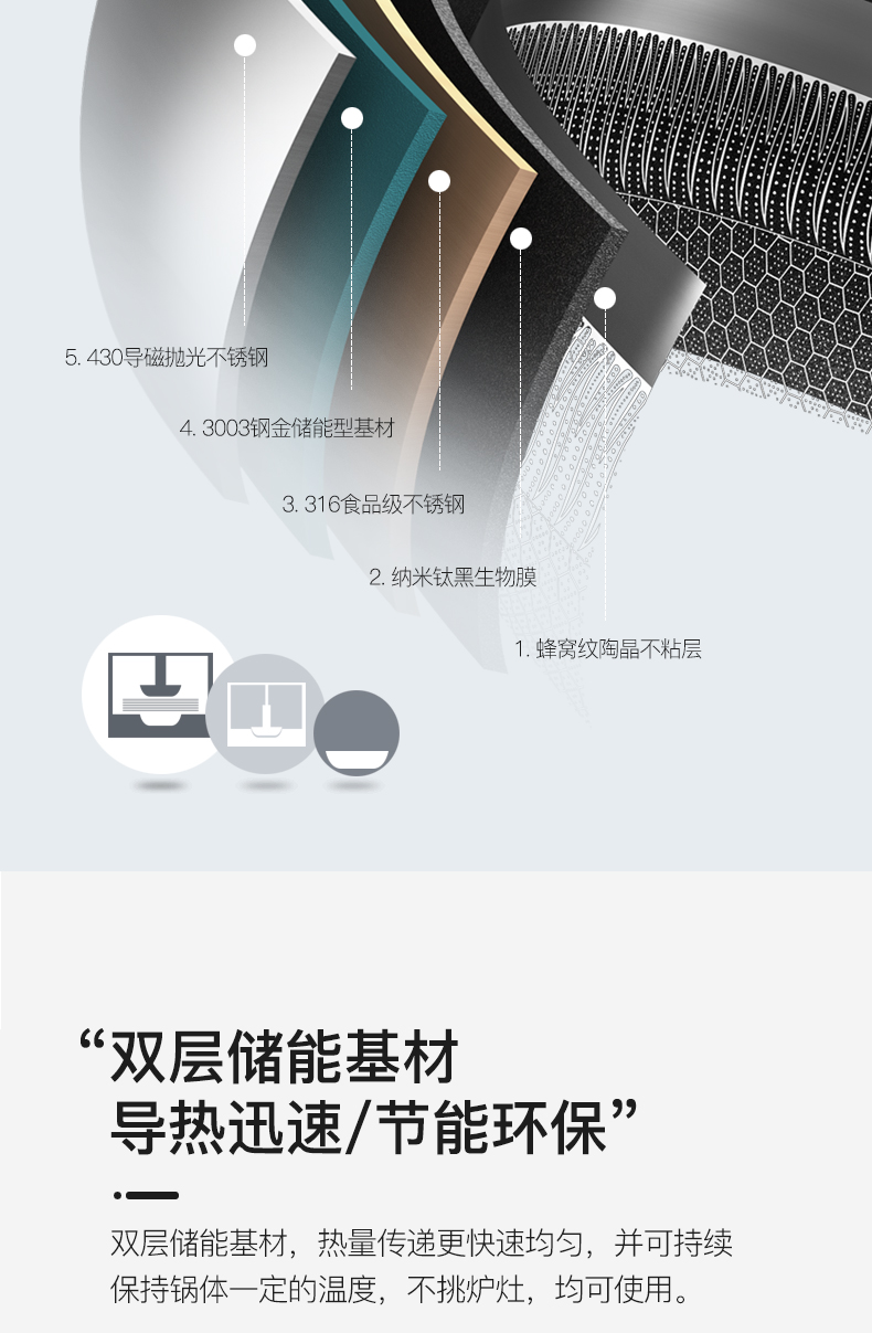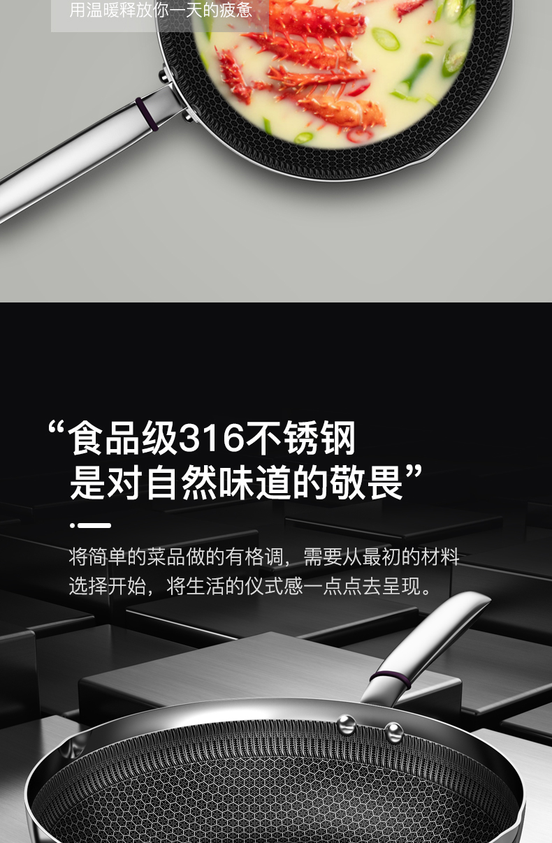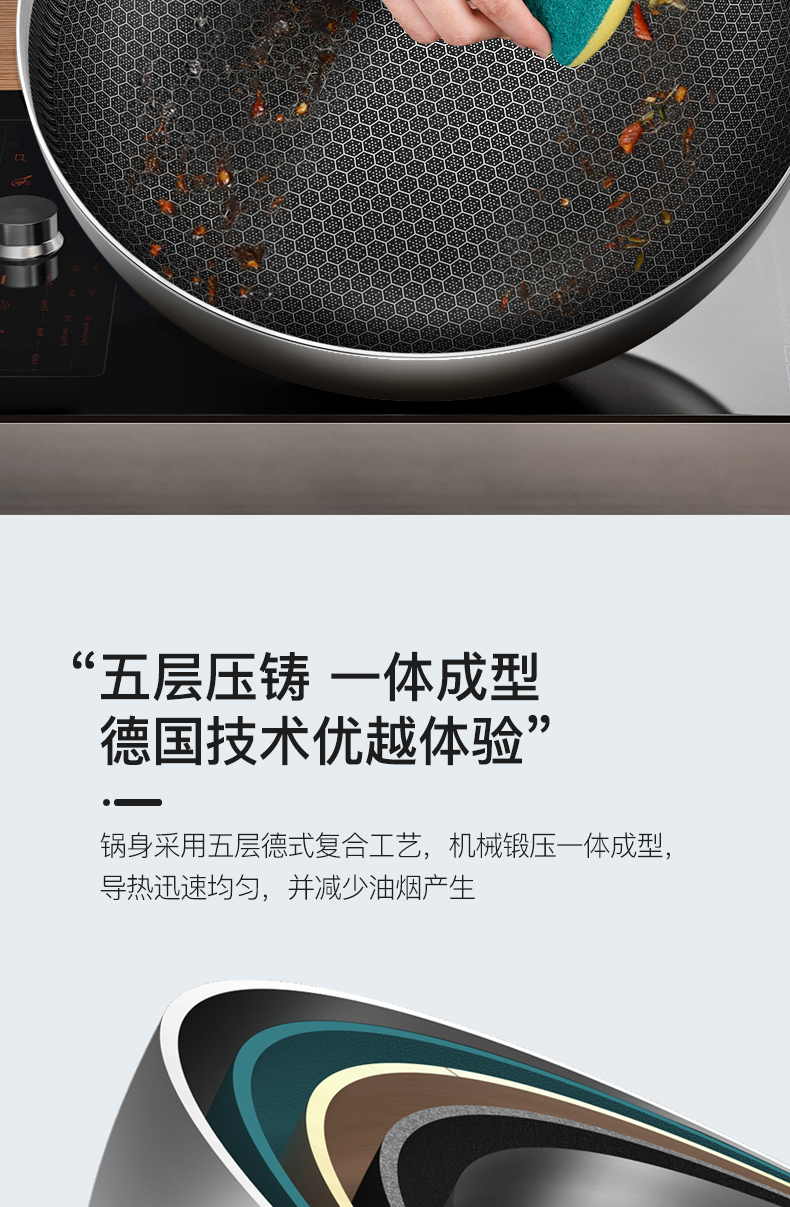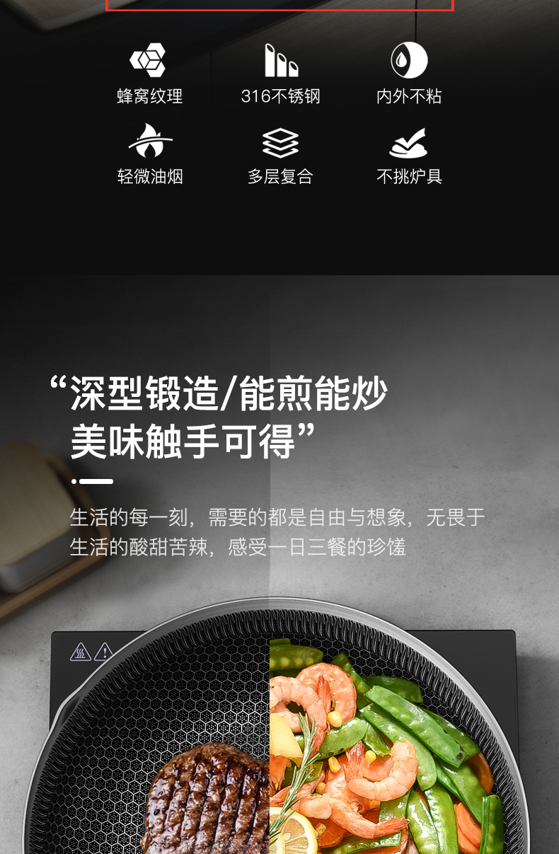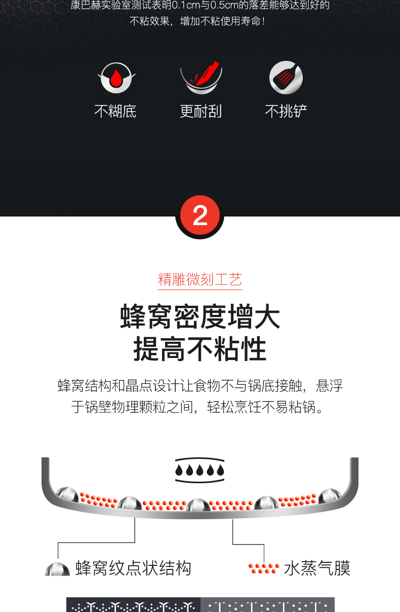 内层蜂窝纹理和精雕技术,不怕剐蹭,锅底不发黄,一擦即净,方便清理。锅底为双层储能基材,升温迅速且均匀,不挑炉灶,燃气灶、电磁炉等都适用。9.5cm锅深设计,煎炒蒸煮都能实现。把手与锅身为加固铆钉,坚固耐用。