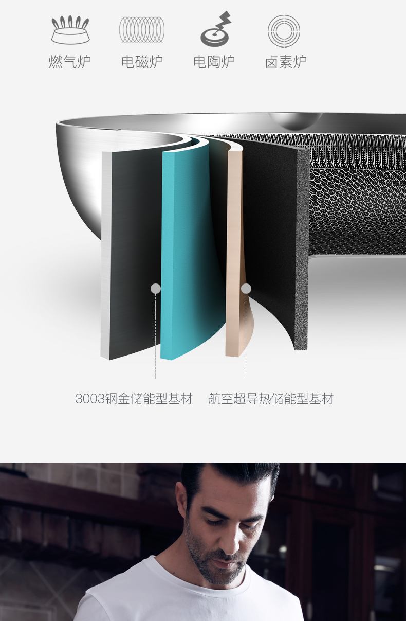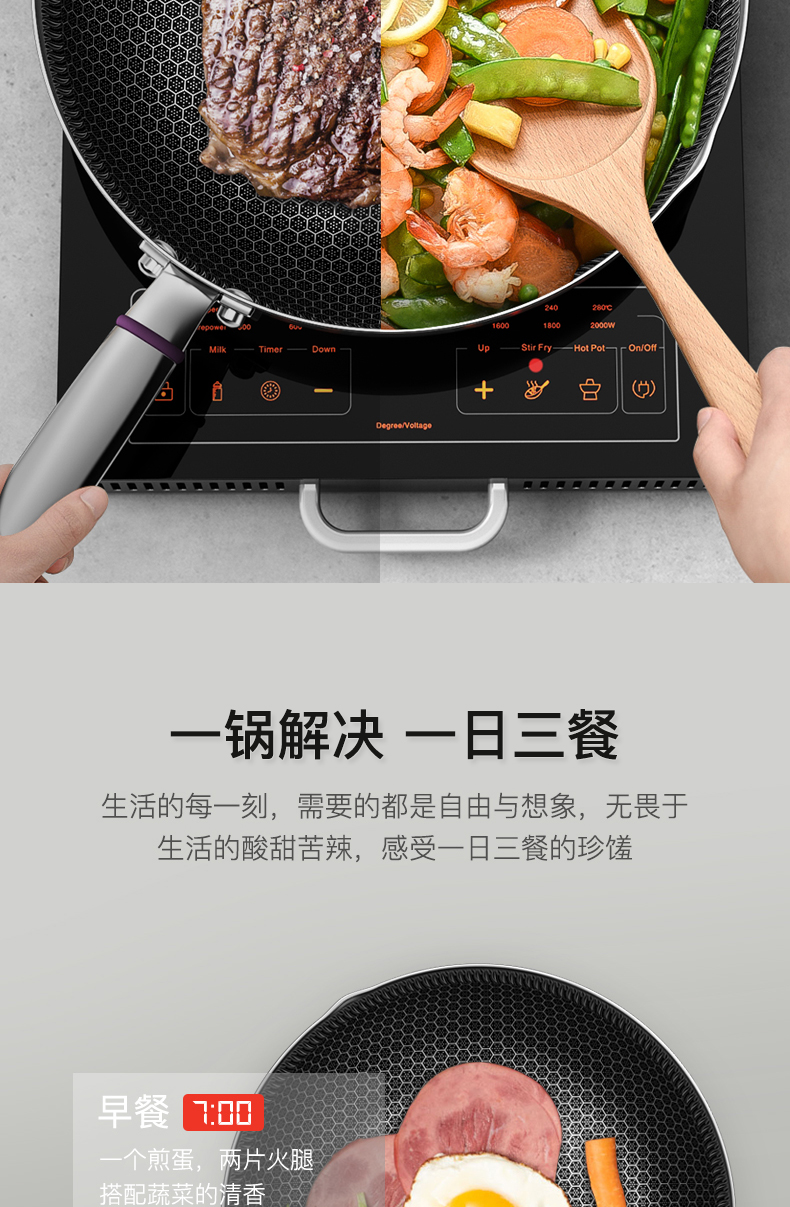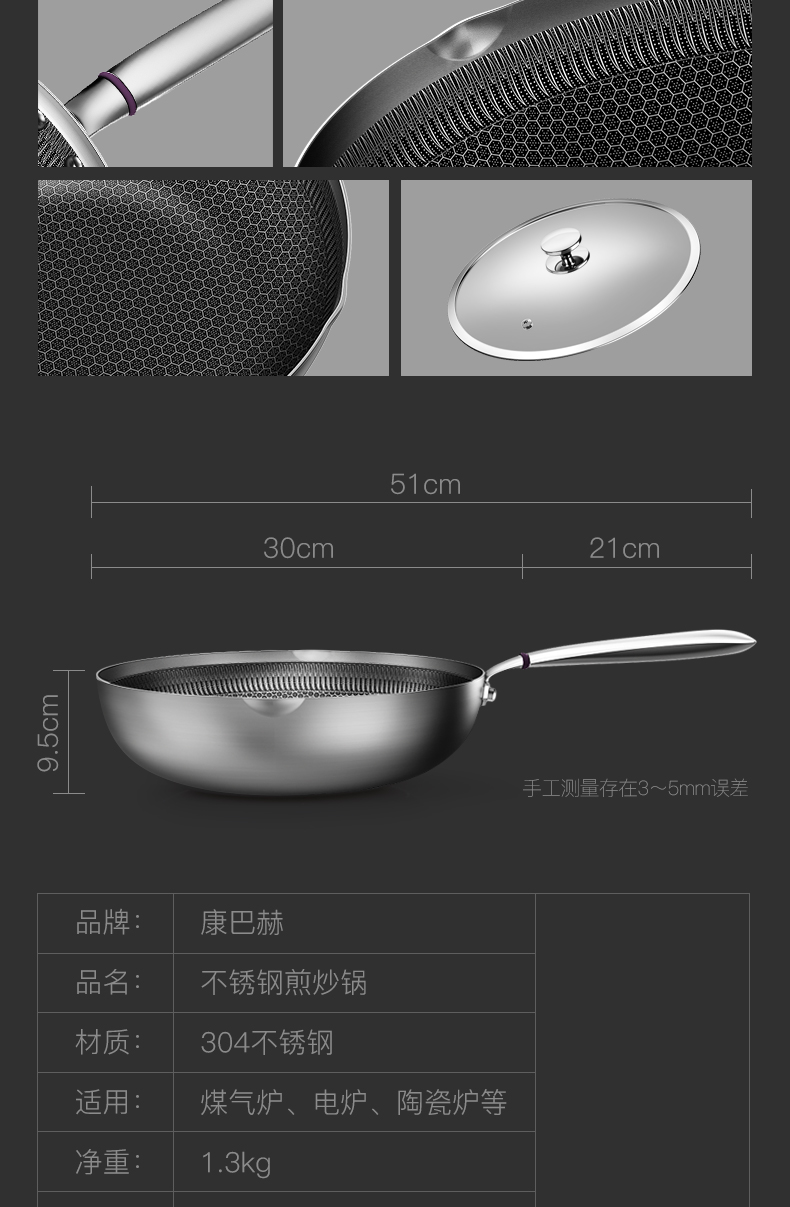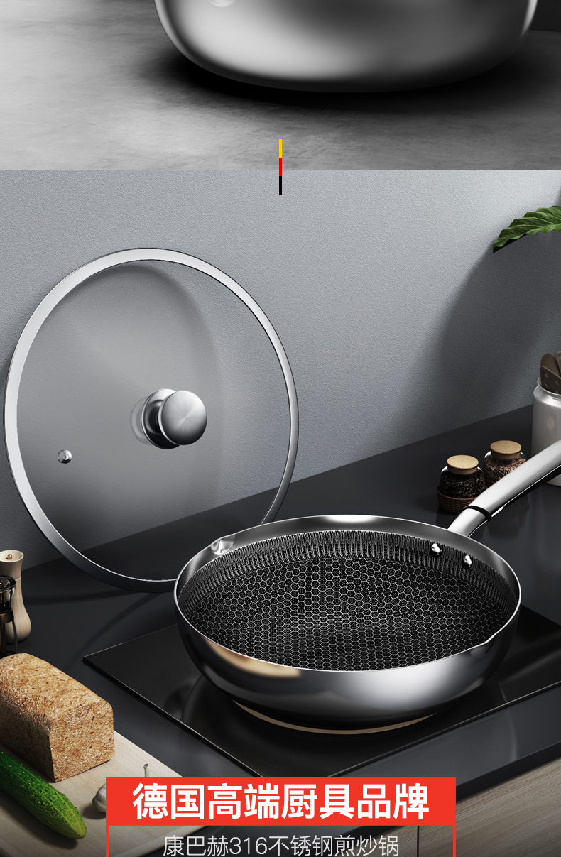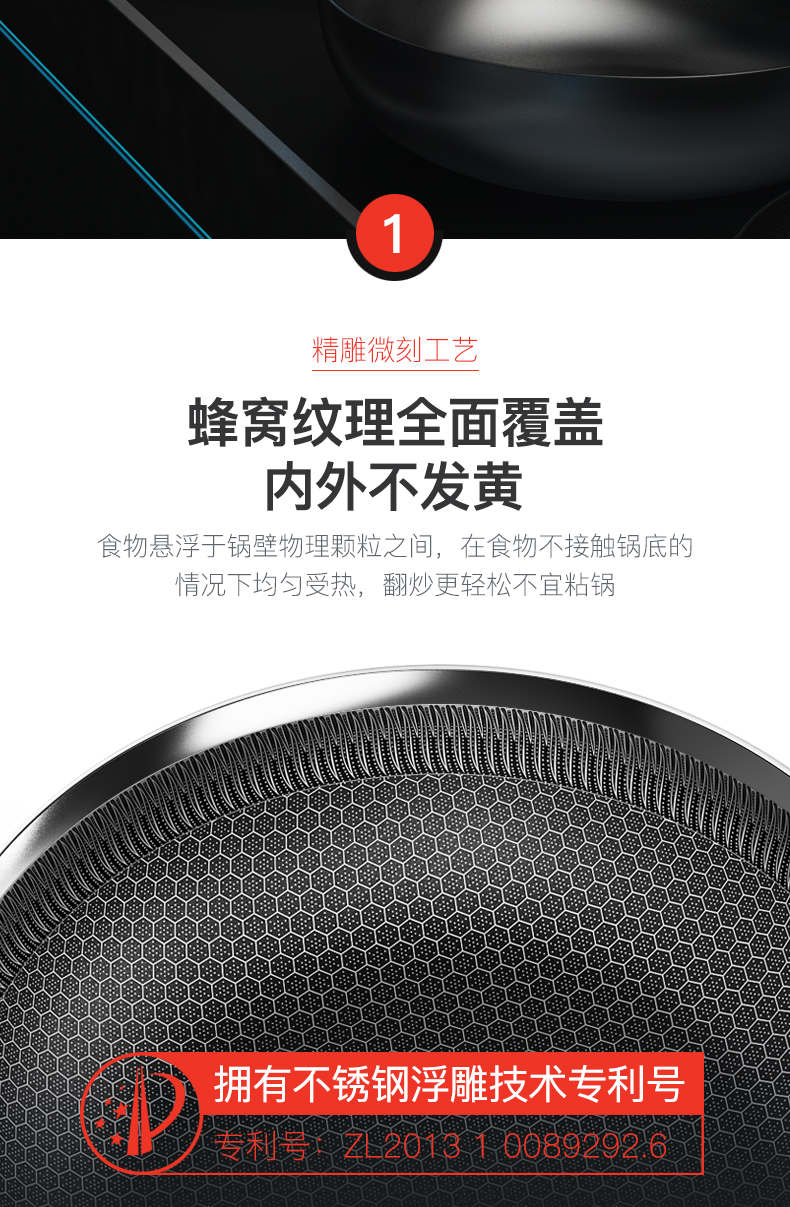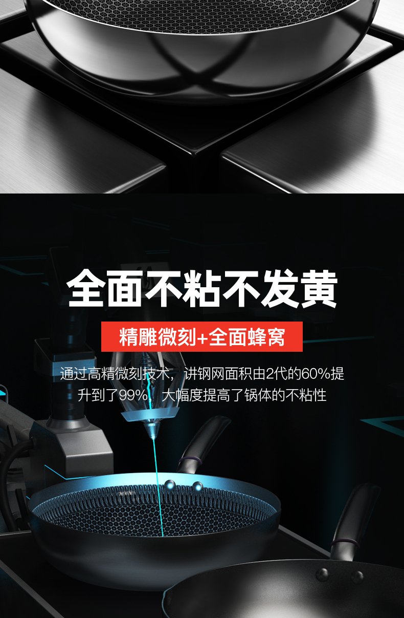 内层蜂窝纹理和精雕技术,不怕剐蹭,锅底不发黄,一擦即净,方便清理。锅底为双层储能基材,升温迅速且均匀,不挑炉灶,燃气灶、电磁炉等都适用。9.5cm锅深设计,煎炒蒸煮都能实现。把手与锅身为加固铆钉,坚固耐用。