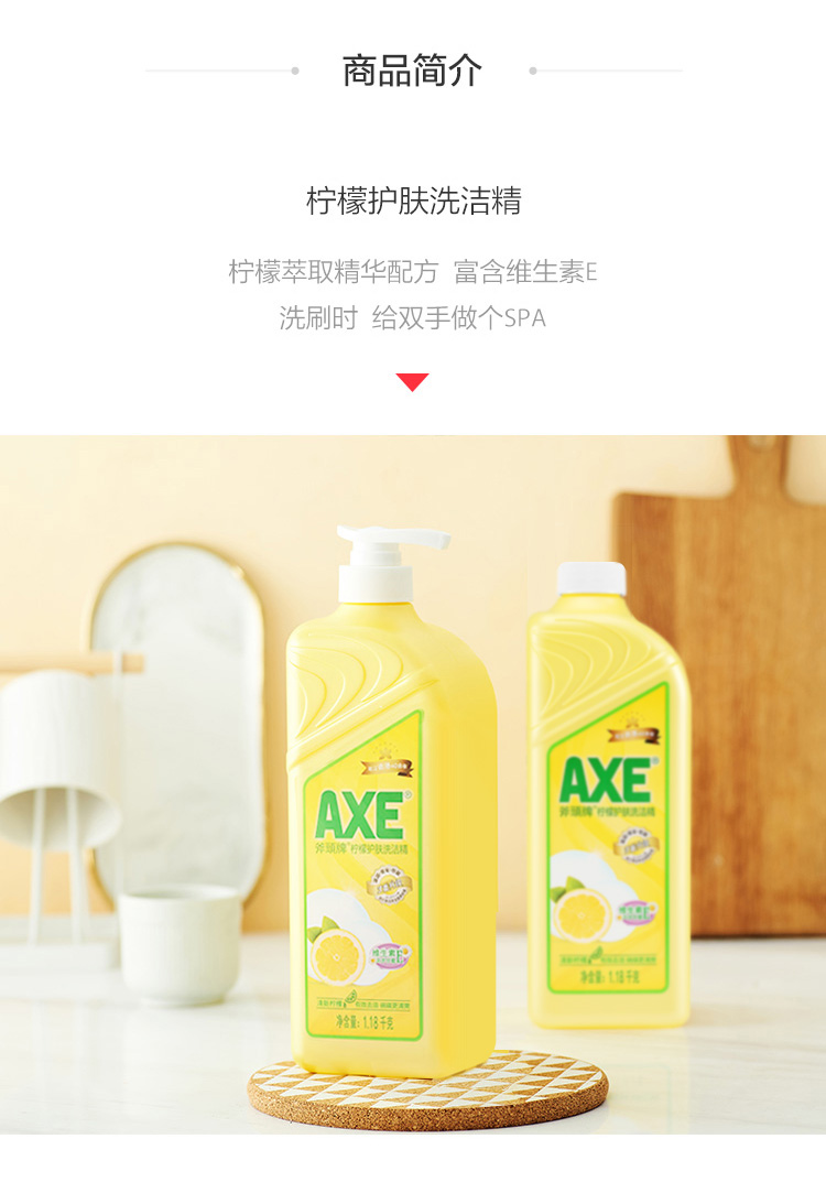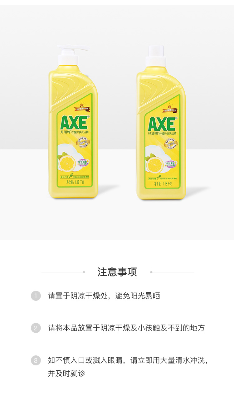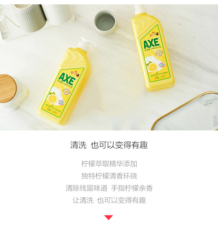 这款AXE 斧头柠檬洗洁精,采用中性配方,蕴含维生素E配方,滋润护肤,不伤皮肤,清洁力比国际高40%,洁净力特强,有效去除多种油污和细菌泡沫适中,过水容易,可用于清洗餐具、厨具、蔬菜、水果等,令碗碟爽洁清新柠檬护肤洗洁精散发清新柠檬香味。