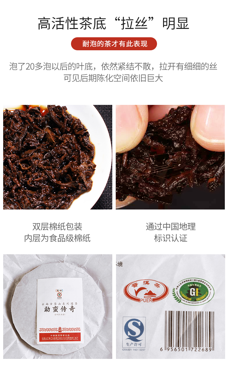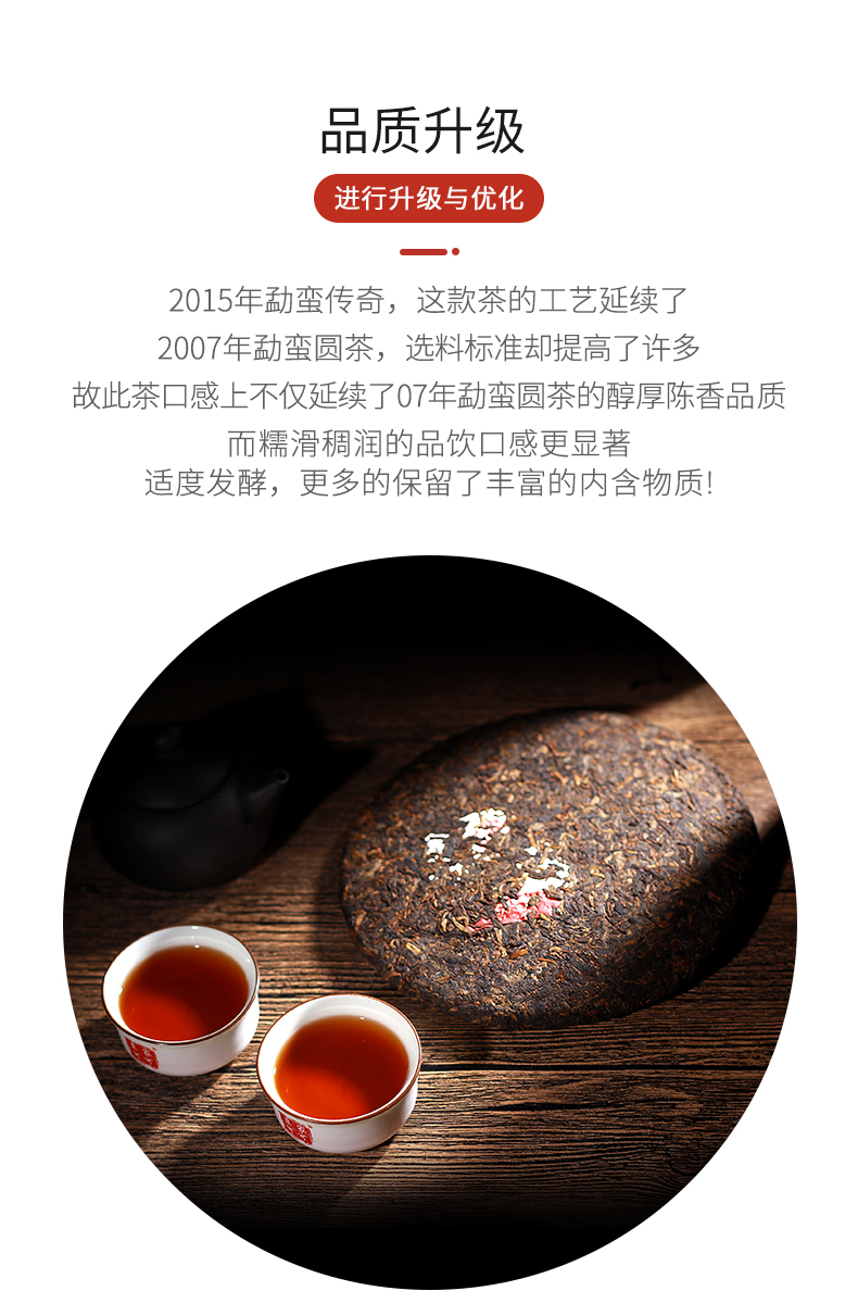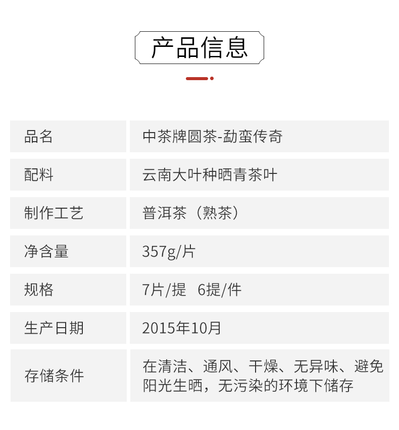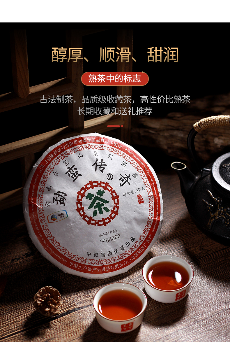 这款普洱茶15年生产,经过五年干仓,加上三年老料压制,刚好是熟茶的黄金品饮期,且产量小市场存量有限。茶饼条索清晰端正,口感醇厚、顺滑、甜润,茶底肥嫩柔软,有光泽。规格:357g。