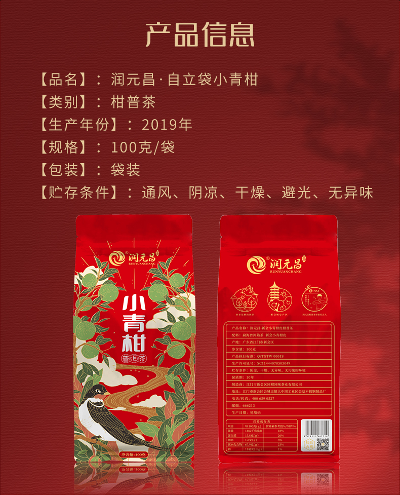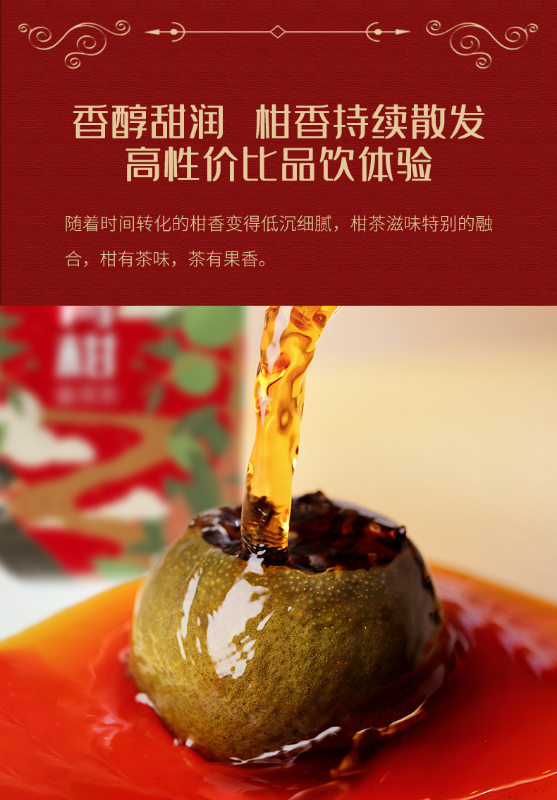 这款采用核心产区七月柑,勐海大叔春茶制成,小青柑果实厚实油室丰富,柑果香浓,茶为果香相互交融,口感细腻耐泡,回味无穷。采用独立包装设计,便于冲泡保存。规格:100g。
