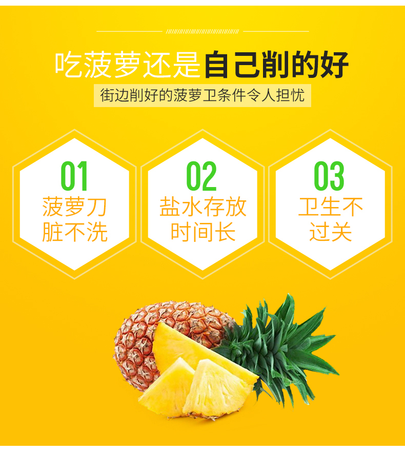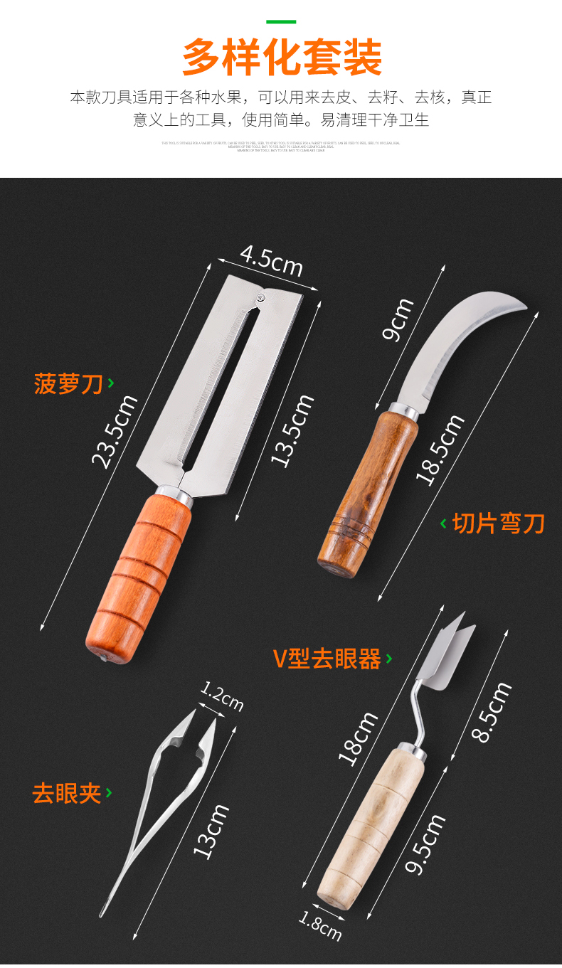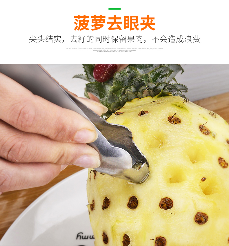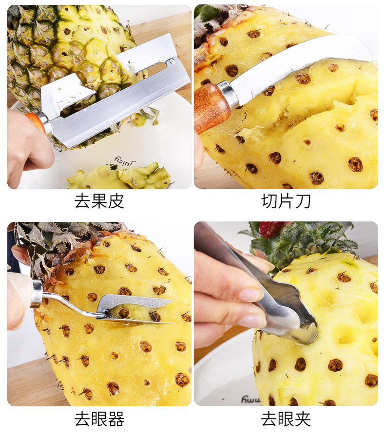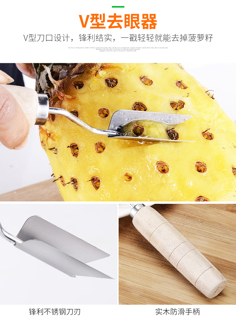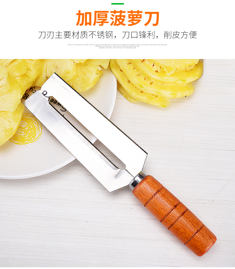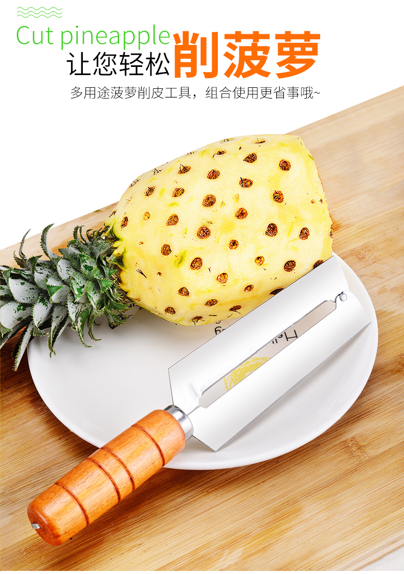天猫德品家居专营店15.8元,可领5元优惠券,实付10.8元到手,多用途削菠萝工具,包含:菠萝刀、切片弯刀、去眼器、V型去眼器。刀刃主要材质为不锈钢,可切可削,实木防滑手柄,手感舒适。自己在家里也可以吃菠萝,干净又省心。