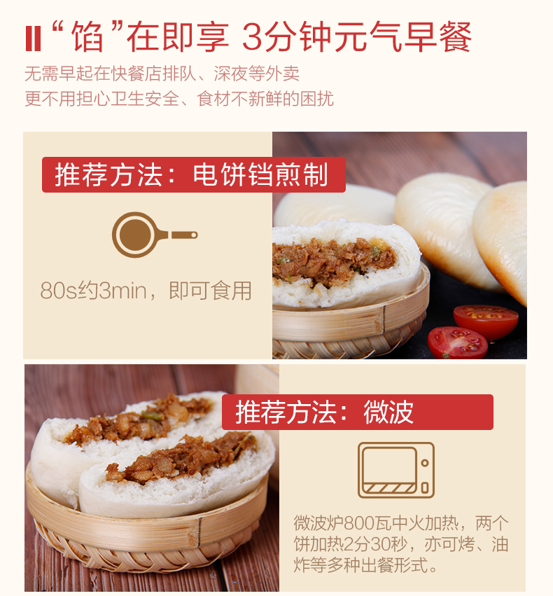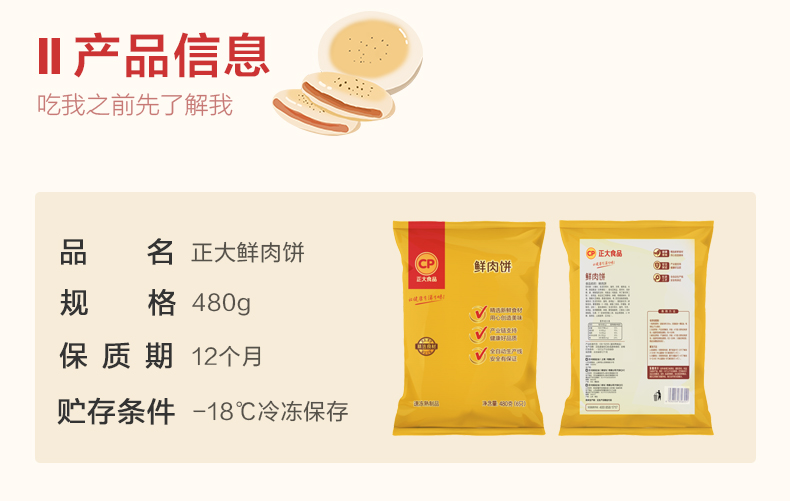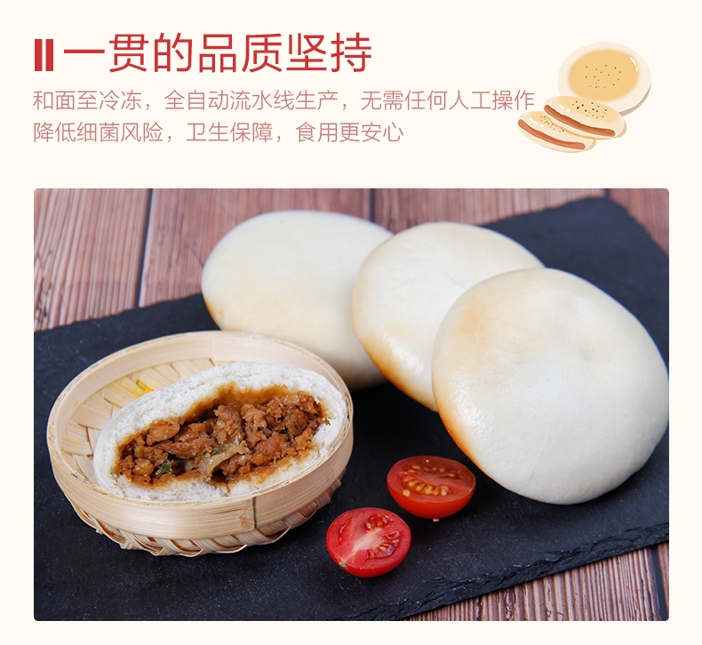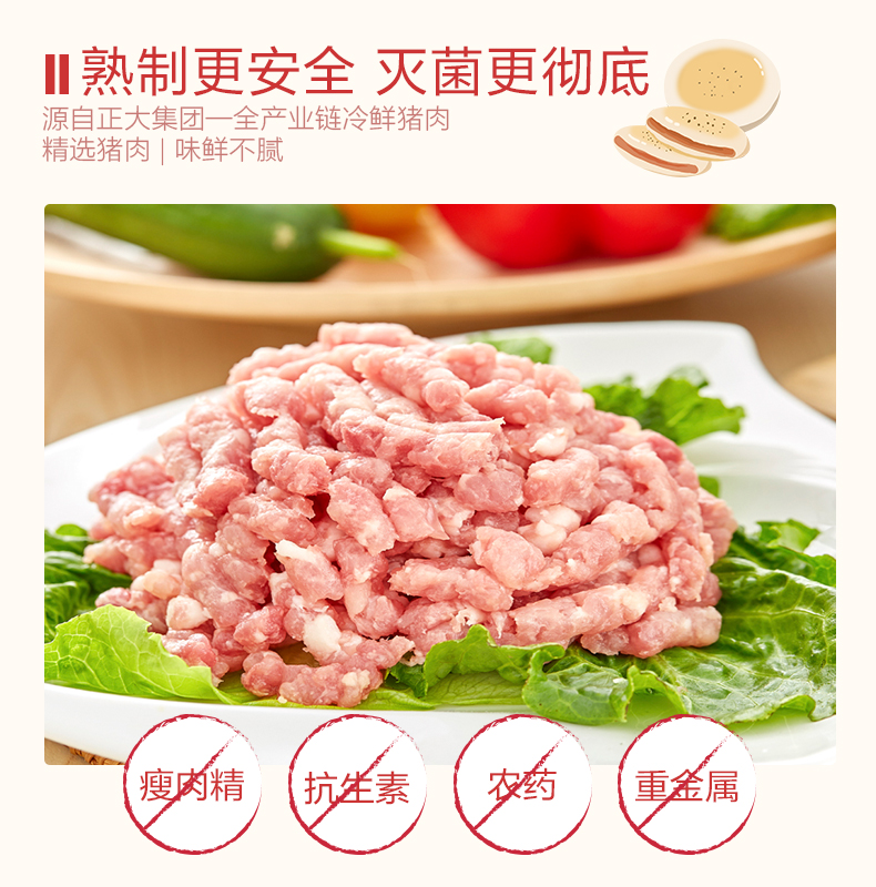 国际大牌正大,精选麦芯雪花面粉制作饼皮,劲道不易烂,内馅大粒猪肉搭配章丘大葱,多汁香醇,成品先经过低温熟制,使面饼暄软柔韧,而且缩短制作时间,然后经过极速冷冻,锁住新鲜与营养,简单制作即可还原现做口感。