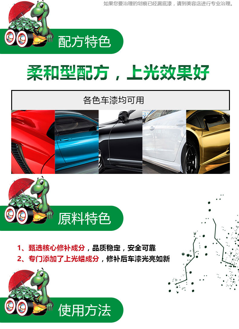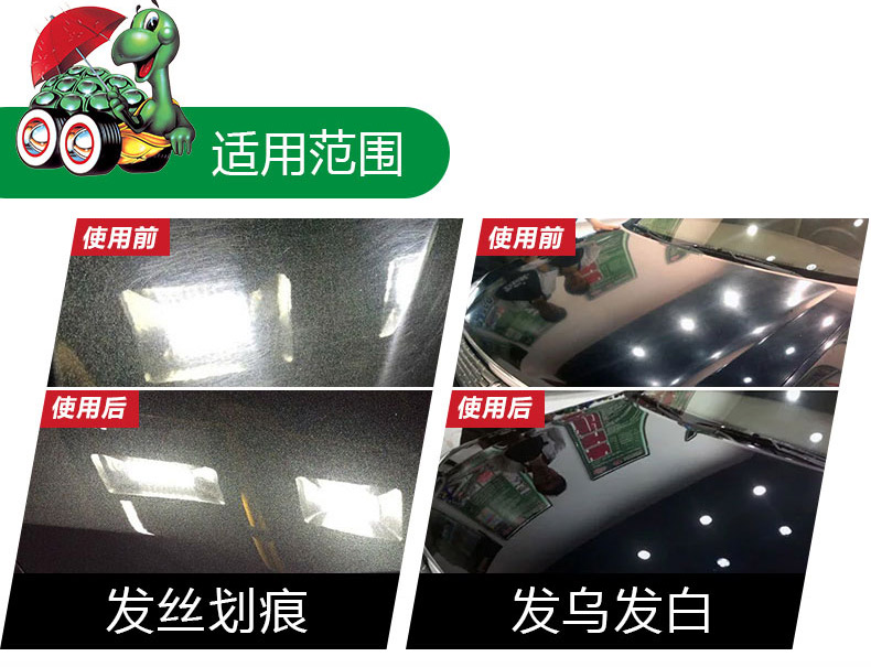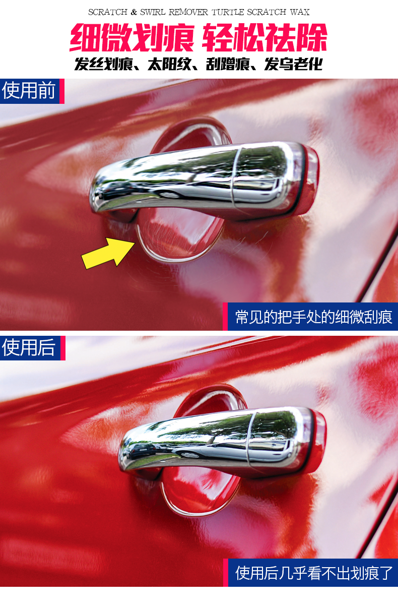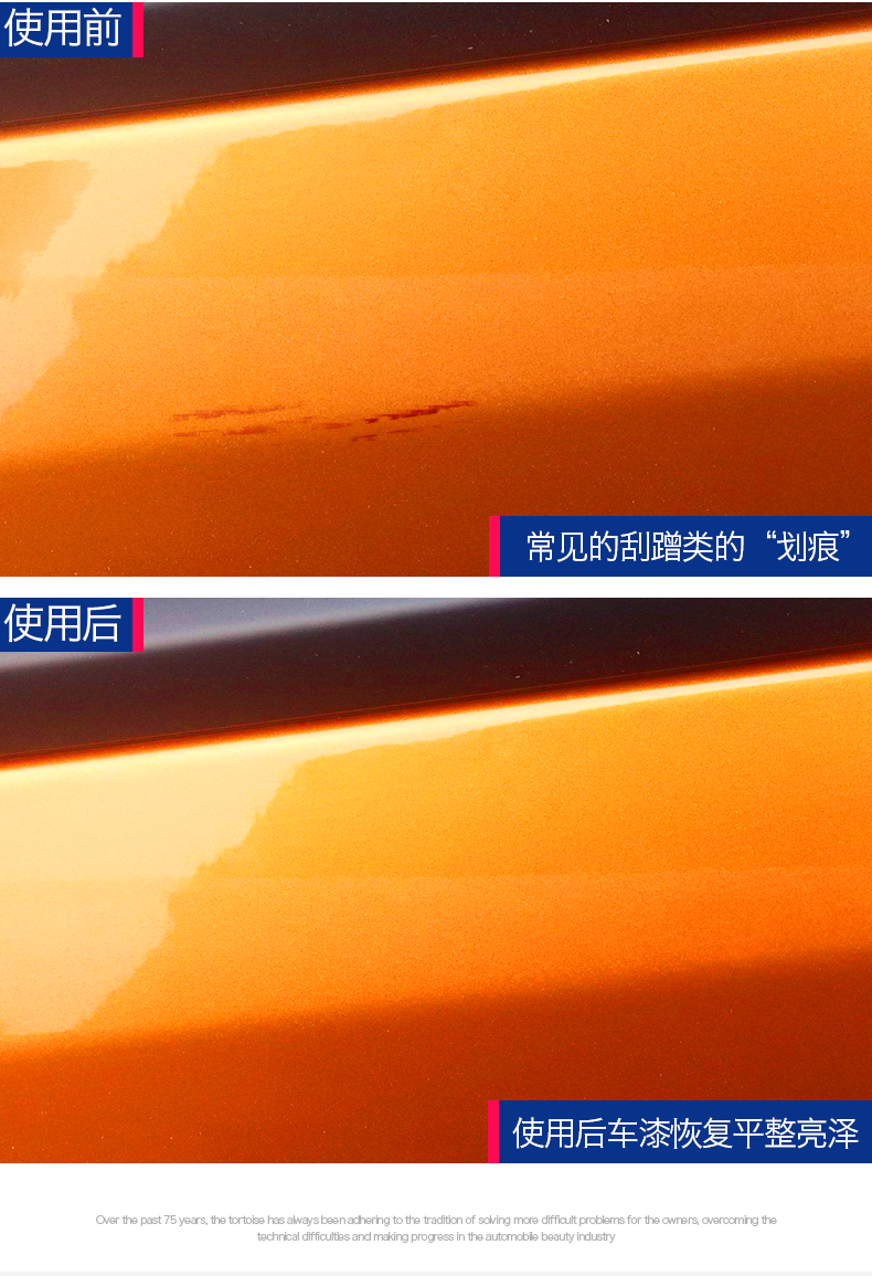 用途:用于修复车漆的表层下次和细微划痕;发丝纹、太阳纹、毛巾擦痕、车漆黯淡发乌、车漆氧化层厚重等。 特点:透明漆配方,使用安全,润滑性强,集修复、还原、上光为一体。 使用:先清洁车漆,将车蜡挤在打蜡海绵或者毛巾上,在划痕处均有涂抹,并反复擦拭,然后使用干毛巾擦净即可。可局部使用,亦可全车使用,将全车进行翻新。 规格:100ml装。